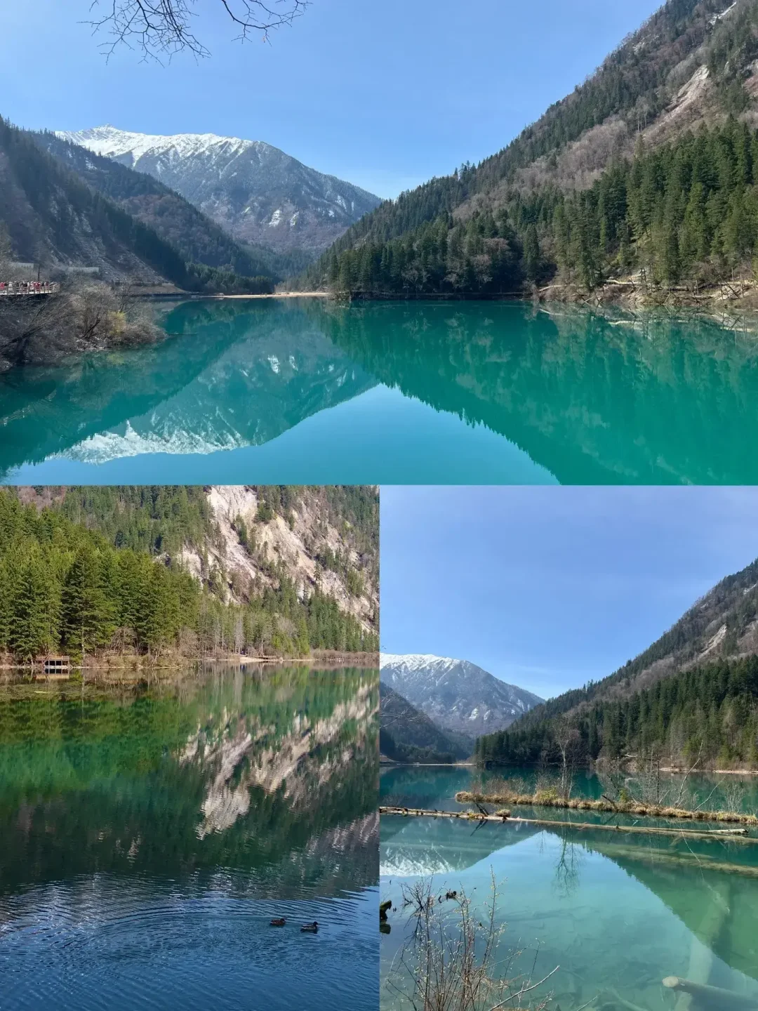 ①箭竹海上车点观景台。早上10点前的湖面非常平静,箭竹与远处的雪山完整清晰的倒映在碧绿的湖面上