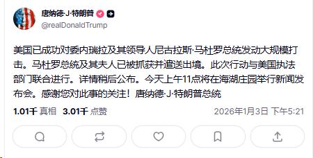突发,特朗普宣布:马杜罗已被抓。 这句话在当地时间1月3日凌晨传遍全球,瞬间点燃了国际舆论,原本就紧张的美委关系,直接被推到了火药桶边缘。 事情得从凌晨的空袭说起,美军对委内瑞拉发动的首轮空袭持续了约一小时,不算长但打击面极广。 拉卡洛塔空军基地、拉瓜伊拉海军基地、玛格丽塔机场、伊格罗特机场这些关键交通和军事节点全被盯上,蒂乌纳堡垒、埃尔阿蒂略通信中心,甚至国防部和议会大楼,将近10个核心目标都遭到了不同程度的打击。 空袭刚停,更混乱的场面接踵而至,加拉加斯以及邻近的伊格罗特、拉瓜伊拉等城市,陆续有目击者透露听到密集的枪战声。 当地居民凌晨被爆炸声惊醒,街上很快就见不到行人和车辆,连记者所在的酒店都封锁了出口,部分区域还出现了断电和电信中断的情况。 就在所有人都聚焦于空袭损失和枪战局势时,特朗普突然通过社交媒体发声,高调宣布马杜罗及其夫人已被抓获,还被带离了委内瑞拉。 据美媒披露,执行这次抓捕任务的,正是曾击毙IS头目巴格达迪的美军三角洲特种部队。 值得注意的是,马杜罗在被抓前已第一时间发声,宣布全国进入紧急状态,签署法令启动全面防御系统,还号召全体人民转入武装斗争抵抗侵略。 有消息称,委方防空系统其实做出了响应,只是没能有效阻止美军行动,并非像部分报道说的那样处于关闭状态。 局势发酵后,哥伦比亚率先表态,总统佩特罗直接谴责美军行动违反《联合国宪章》,作为刚加入安理会的成员国,哥方还要求立即召开安理会会议。 古巴也紧随其后发声,痛批这是针对拉丁美洲的国家恐怖主义行径。 客观来看,这次事件绝非偶然,此前特朗普就曾宣布封锁受制裁游轮,还空袭过委内瑞拉疑似毒品码头,这次行动早有铺垫,军方甚至多次计划行动,只是因天气等原因推迟。 特朗普没提前通知国会就动武,本质上还是霸权逻辑作祟,想通过军事手段强行干预他国内政。 眼下,委副总统已公开要求美方提供马杜罗活着的证据,洛佩斯也呼吁民众团结抗敌。 特朗普承诺会召开新闻发布会说明后续计划,但无论如何,这场军事打击都给拉美地区稳定埋下了隐患。 后续联合国是否会介入,国际社会的谴责能否起到约束作用,都得打个问号。毕竟,靠武力解决问题的老路,从来都走不通。 大家对此怎么看?欢迎评论区留下您的观点!