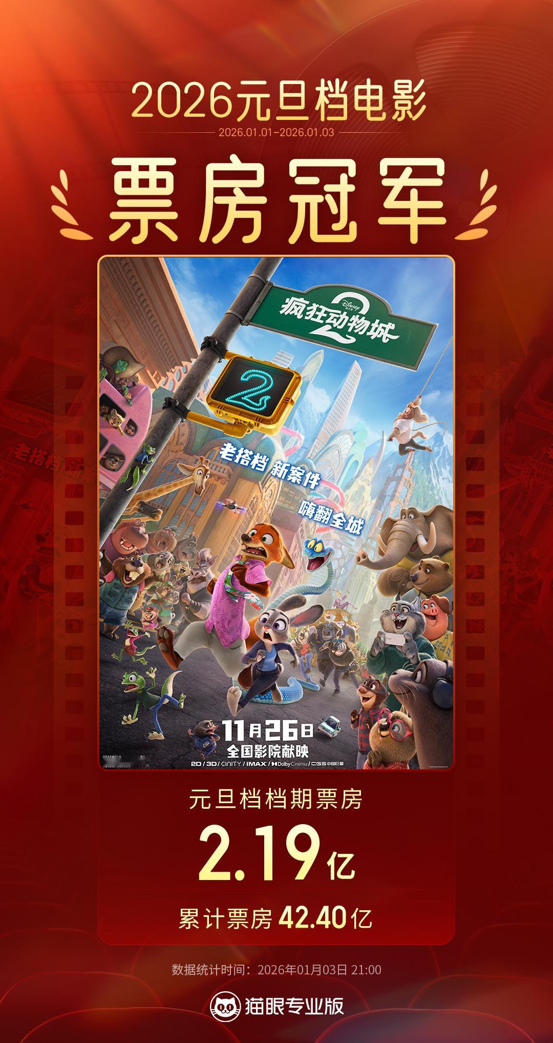 疯狂动物城2成元旦档票房冠军 据猫眼专业版数据,截至1月3日21时,《疯狂动物城2》累计报收票房2.19亿,成2026年元旦档票房冠军,截至当前累计票房已超42.40亿,即将登顶中国影史进口片票房榜。2026年元旦档票房7.34亿