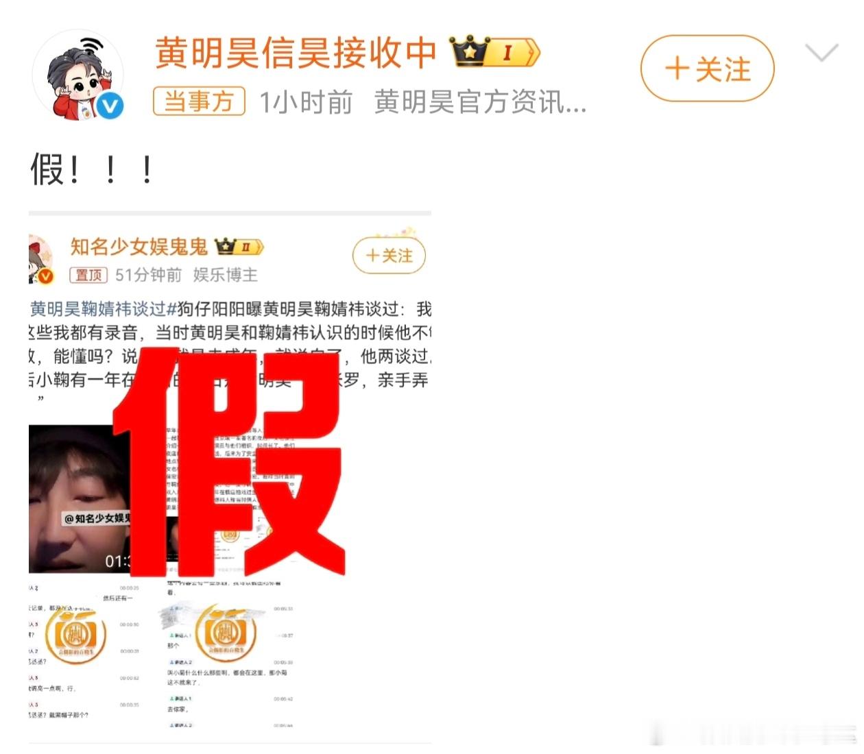 鞠婧祎方和黄明昊方双双辟谣,否认彼此谈过,假!