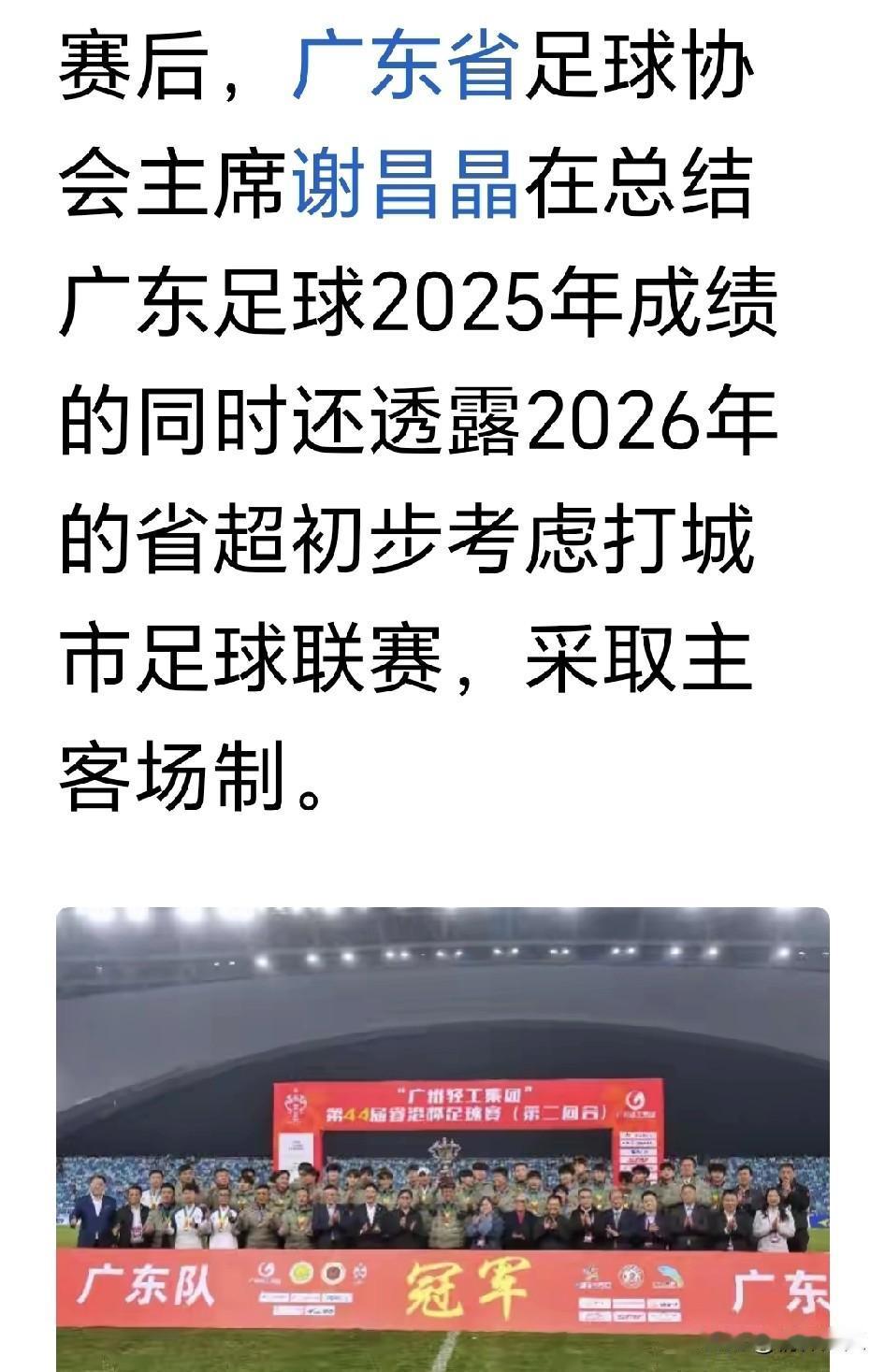 湛江球迷有眼福了!2026年广东省足球超级联赛将举行城市联赛,实行主客场比赛!湛江足球队是以吴川青年队代表,还是另外组队?主场是设在湛江体育中心还是湛江奥体中心?大家有什么想法?欢迎各抒己见,集思广益嘛。 据报道,广东省足协主席谢昌晶近日表示:广东省足球超级联赛2026年赛季将效仿“苏超”,进行城市联赛,实行主客场赛制。这个消息肯定让广东省足球球迷兴奋不已,期待已久的城市足球联赛真的来了。