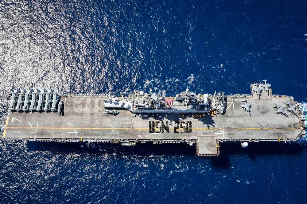 短暂关押委内瑞拉总统马杜罗黄蜂级两栖攻击舰硫磺岛号(LHD 7)的火力不强,由于没有电磁弹射,只能飞行鱼鹰飞机,直升飞机,老古董级的鹞式垂直起降战斗机。 2025年10月9日,加勒比海,美国海军水手们在黄蜂级两栖攻击舰硫磺岛号(LHD 7)飞行甲板上参加海军250周年纪念摄影演习。美军部署至加勒比海,支持美国南方司令部的任务、战争部指挥的行动以及总统的优先事项。