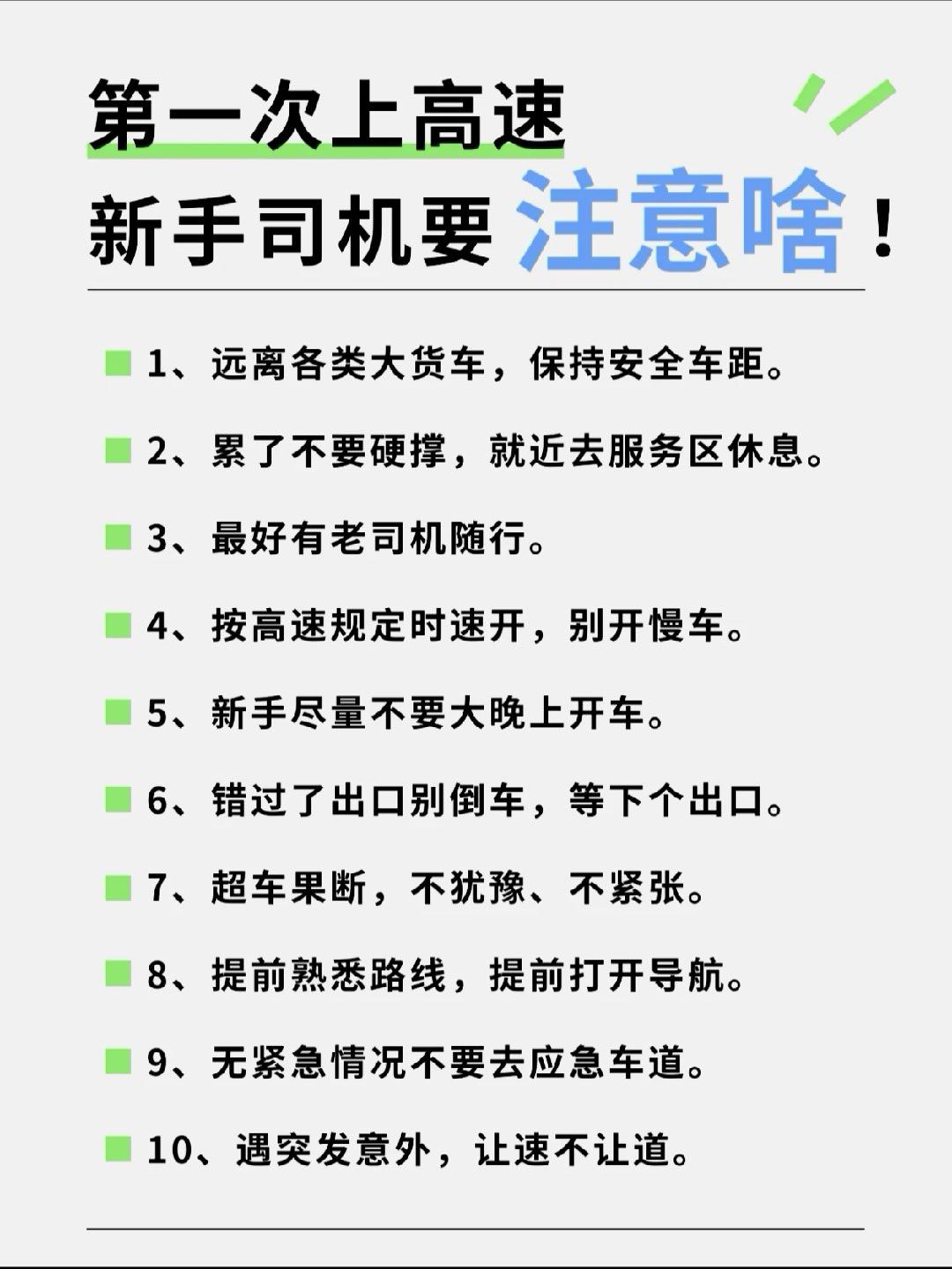 新手上高速别慌,看完这些包你变成老司机1、远离各类大货车,保持合适车距。2、累了不要硬撑,就近去服务区休息。3、尽量找个老司机随行。4、按高速规定时速开,别开慢车。5、新手尽量不要大晚上开车。6、错过了出口别倒车,等下个出口。7、超车果断,不犹豫、不紧张。8、提前熟悉路线,提前打开导航。9、无紧急情况不要去应急车道。10、遇突发意外,让速不让道。我与汽车的日常大v聊车