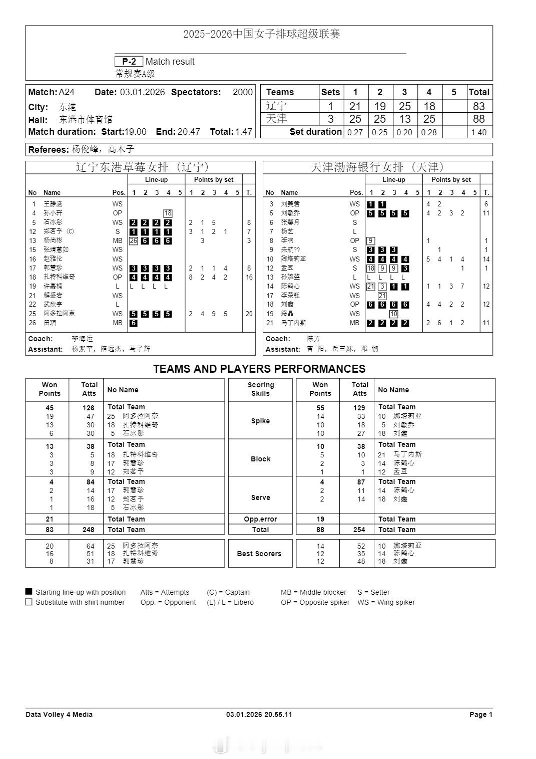 2026年1月4日-2025-2026CBA常规赛第10轮(第一阶段第10轮) 北控89-93广东/上海95-90宁波(上海男篮获得六连胜/宁波男篮终结四连胜)(潜力赛:29-21)/深圳92-82浙江稠州(浙江稠州男篮终结三连胜)(潜力赛:23-25)/四川97-109青岛(四川男篮遭遇十连负 继续一胜难求积分榜垫底)/浙江广厦77-74险胜北京(卫冕冠军浙江广厦男篮获得八连胜 主客场双杀对方 暂时领跑积分榜) 2025-2026WCBA常规赛A组第12轮(第一阶段第12轮) 新疆78-61大胜北京(北京女篮遭遇六连败)/山西86-56大胜武汉(武汉女篮遭遇四连败)/江苏66-84被东莞(广东)逆转(卫冕冠军广东女篮获得十二连胜 继续保持不败 领跑积分榜)/上海97-62大胜浙江(上海女篮获得四连胜) 2025-2026女排超级联赛第一阶段第6轮 A级 河南3-0福建(25-13 25-20 25-21)(升班马河南女排获得两连胜 暂时逃离升降区/福建女排遭遇三连败 暂时降至小组积分榜倒数第二)/江苏3-0山东(25-21 25-14 25-20)(卫冕冠军江苏女排获得四连胜/山东女排终结两连胜 遭遇赛季第二败)/辽宁1-3天津(21-25 19-25 25-13 18-25)(天津女排获得两连胜/上届季军辽宁女排遭遇六连负 继续一胜难求小组积分榜垫底 但是本场比赛看到了变化) B级第7轮 云南3-0河北(25-22 25-14 25-16)(河北女排遭遇三连败)/浙江3-0江西(25-20 25-13 25-12)(浙江女排获得三连胜)/四川0-3广东(深圳)(18-25 14-25 18-25)(广东(深圳)女排获得三连胜/四川女排遭遇三连败) 部分重点赛事预告:CCTV5直播:12:55 世界职业拳王争霸赛 19:30 2025-2026CBA常规赛第10轮(第一阶段第10轮) 辽篮-吉林 CCTV5+直播:19:00 2025-2026男排超级联赛第一阶段第6轮 A级 *天津-山东 CCTV5客户端直播:15:30/16:30/19:00 2025-2026男排超级联赛第一阶段第6轮 A级 辽宁-广东/上海-北京/浙江-河北 15:30(2场)/19:00 B级第7轮 云南-河南/福建-湖北/四川-江苏 其他:19:35(4场) 2025-2026CBA常规赛第10轮(第一阶段第10轮) 福建-新疆/*南京(同曦)-山东/山西-江苏/天津-广州 19:30(3场) 2025-2026WCBA常规赛A组第12轮(第一阶段第12轮) 陕西-四川/山东-石家庄(河北) B组第12轮(第一阶段第12轮) 厦门-大连(辽宁)