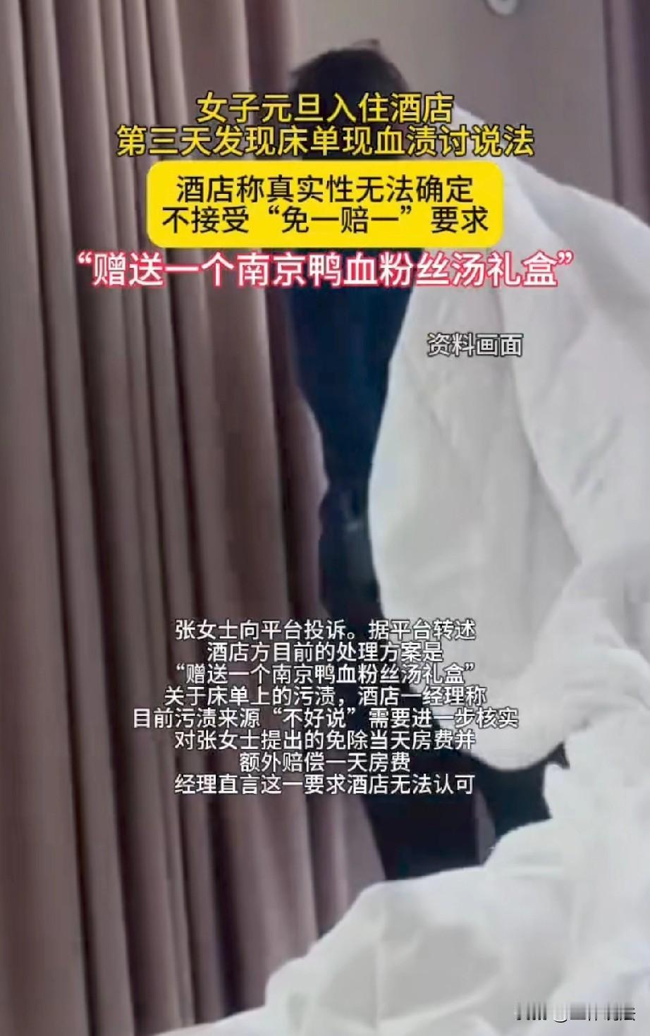 江苏南京,女子和丈夫出门旅游,花1044元订了三天酒店,谁知,住到最后一晚时,她突然发现床单上有几片褐色血迹。女子心里恶心又膈应,更担心染上传染病,于是,马上联系酒店,要求退掉当天房费并赔偿她一天。酒店经理查看完后,确认是血迹,马上更换了床单被罩,但表示,血迹的来源并不明确,没法退一赔一,让她不要咄咄逼人,补偿她一个鸭血粉丝礼盒。这敷衍的态度让女子瞬间气炸。 元旦期间,张女士好不容易休假,便和丈夫满心欢喜地从宁波出发,到南京旅游。 他们提前预订了一家酒店,从12月31日住到1月2日,三天的房费总共是1044元。 到了酒店,张女士顺利办完入住,开开心心的住了进去,前两天一切正常,万万没想到,1月2日晚上23时左右,一个发现让她的好心情瞬间消失。 玩了一整天的张女士疲惫的回到酒店,洗了个舒服的热水澡后准备休息,谁知,当她掀开被子,却突然发现,床单上有几片明显的红褐色血渍。 这卫生状况让张女士心里特别膈应,这已经是他们住的最后一天,前两天她没仔细看,会不会也是在这样不卫生的条件下睡过来的? 看着难受倒还是小事,她更担心自己和丈夫会不会因此染上什么病,想到这,她既担心又生气。 于是,她马上就跟酒店反映了情况。很快,酒店经理出面跟她沟通。 张女士带着经理来到房间,现场确认了床单上的污渍确实就是血迹,经理看完后,安排人给张女士换了床单被罩。 但是,张女士觉得仅仅是这样还不够,酒店的态度也不够诚恳,前两天的状况如何,她已经拿不出证据,但她要求,退还当天房费,并赔偿一天房费。 对于张女士退一赔一的要求,经理表示已经超过了自己的处理权限,她需要向领导汇报一下,承诺第二天早上会给出具体的赔偿方案。 看经理说的有鼻子有眼,张女士没有再追究,等第二天酒店给出的处理方案。 可等到第二天退房的时候,张女士还是没有接到任何关于处理方案的电话。 因为她赶时间,离开之前必须要把这件事解决明白,所以马上到前台去询问进展。 没想到,前台的一位女员工态度特别强硬,突然改口否认,说床单上的根本就不是血,可能是机油。 接着,她质问张女士:“我们不是已经给你换过床单了吗?你是不是想借此故意索赔?”甚至说张女士这样是咄咄逼人。 一听这话,张女士瞬间气懵了,自己明明是受害者,怎么在酒店眼里就成了故意找事想讹钱的人呢?这酒店毫无担当,太不负责了。 思来想去,张女士实在咽不下这口气,她向预订平台进行了投诉,并再次明确了自己退一赔一的诉求。 很快,酒店经理对此事做出了回复,他表示,对于床单上污渍的事情,来源不好说,真实性也无法证明,还说需要进一步核实。 至于张女士提出的退一赔一方案,酒店方无法认可,目前,他们给出的解决方案是,赠送张女士一个南京鸭血粉丝汤礼盒。 这敷衍了事的态度可把张女士气得不轻,她一气之下将此事曝光到了网上,希望大家擦亮眼睛,避雷这家店。 《消费者权益保护法》第7条规定:消费者在购买、使用商品和接受服务时享有人身、财产安全不受损害的权利。消费者有权要求经营者提供的商品和服务,符合保障人身、财产安全的要求。 张女士入住酒店,已经与酒店成立住宿服务合同,酒店负有提供符合卫生与安全标准的住宿环境的法定义务,其中就包括床品“一客一换”、清洁无污渍,这是保障消费者人身安全的基础。 但张女士在入住期间,发现床单有血迹,酒店经理现场已确认,表明酒店未履行清洁与安全保障义务,侵害了其安全权与健康权。 随后,酒店以“血迹来源不明”抗辩不能免除责任,按举证责任分配,酒店应证明血迹系张女士自身所致,否则应承担不利后果。 仅更换床品并以鸭血粉丝礼盒敷衍,明显未弥补其权益受损。 而且,后续前台改口否认、质疑索赔动机,进一步激化了双方矛盾,违背诚信原则与经营者应尽的补救义务。 所以,张女士有权通过平台投诉、行政举报或诉讼等方式,进一步主张权利,要求赔偿。