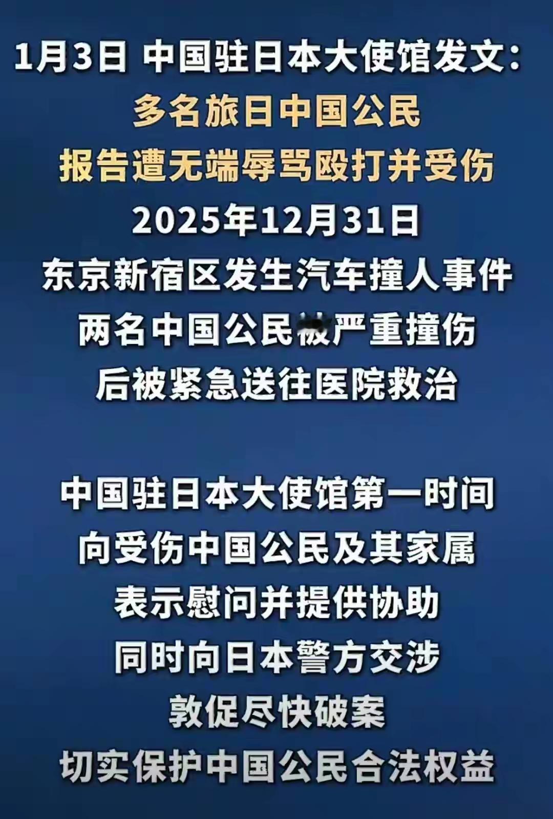 近期多名不顾国家安全风险提醒、执意跑到日本去的中国人,用受伤为自己的任性买了单。 中国驻日大使馆发文,近期多名跑到日本去的中国人,遭到无端辱骂殴打并受了伤,特别是2025年12月31日,两名中国人被汽车恶意撞成了重伤,幸亏中国驻日大使馆第一时间出面,向受伤的中国公民及家属提供协助并表示慰问,同时也向日本警方交涉,敦促日警方尽快破案,切实保护中国公民的合法权益。 当前由于日本右翼势力活动猖獗,造成中日关系异常紧张,国家接连几次发布赴日安全风险提醒,可总有些人偏偏置国家安全风险提醒于不顾,彰显自己的个性,近期非要跑到日本去,自己受伤不说,还给中国驻日大使馆添麻烦,何苦哦!