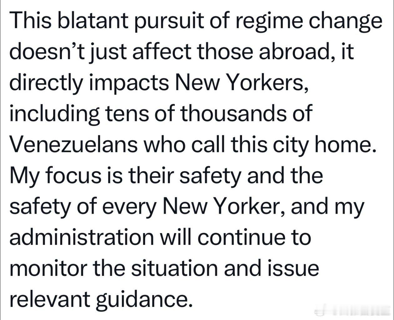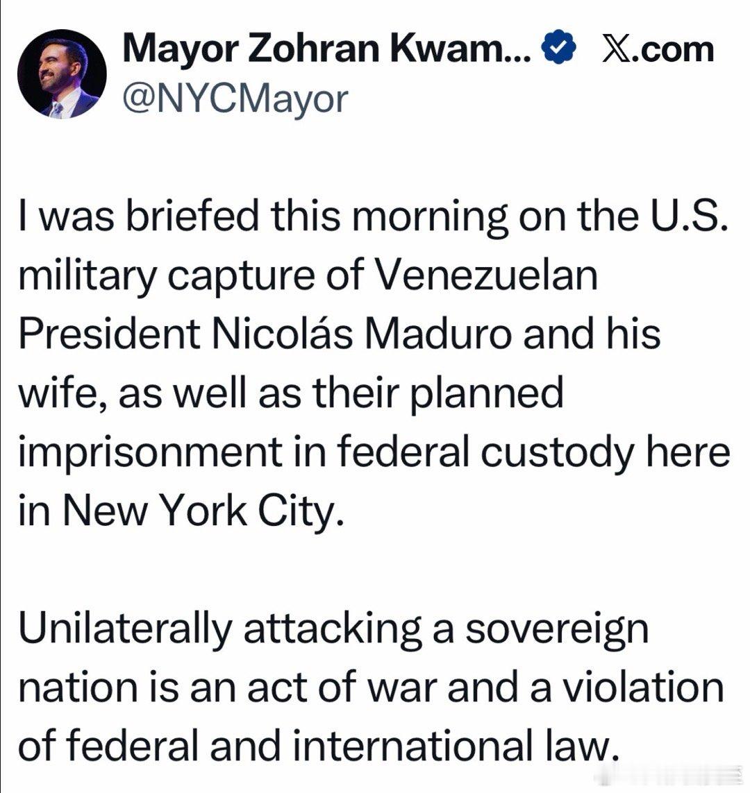 马杜罗已经到达纽约市,将在纽约州联邦法院受审,被指控的罪名是“毒品恐怖主义”纽约市长对此事表态:进攻主权国家,违反联邦和国际法…推翻外国政府,不仅影响外国人,也影响美国人…纽约有数以万计委内瑞拉裔居民,我的关注点,是保障这部分人和所有纽约人的安全