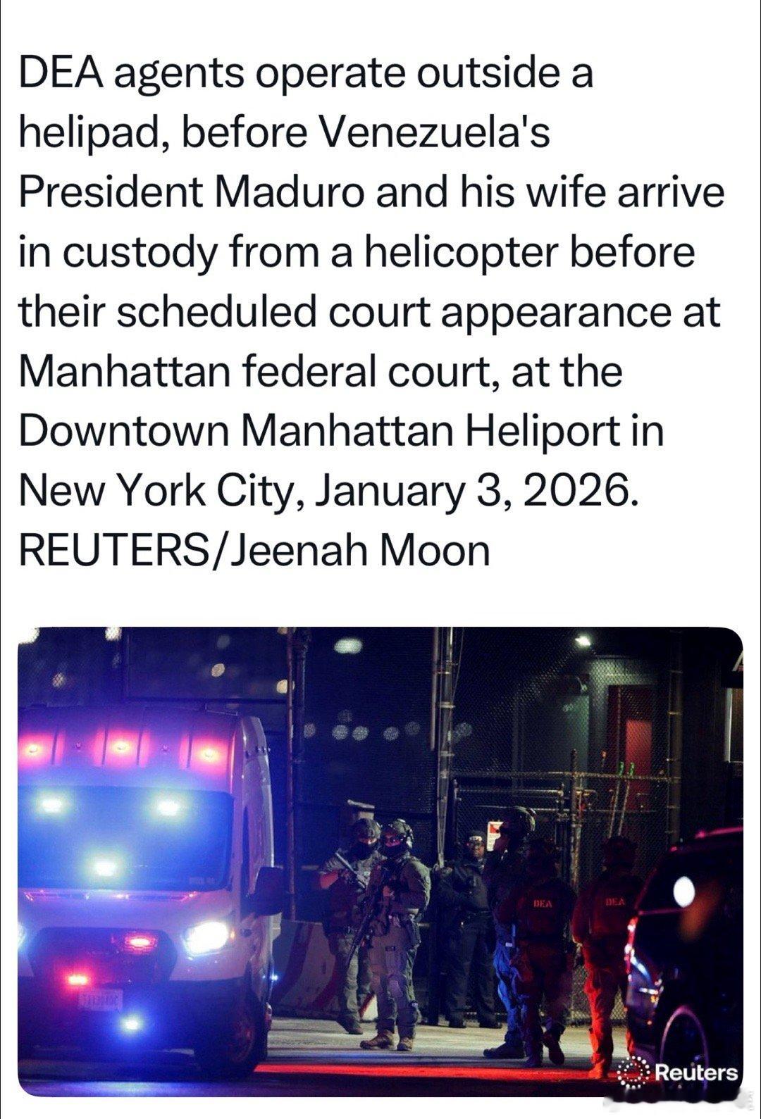 美国总统在新闻会上提到:“军队与law enforcement合作”这里的“执法部门”不是指“警察”,而是联邦缉毒署(Drug Enforcement Administration,缩写DEA)押送马杜罗上直升机(图一)、进纽约监狱(图二)的特警,身上都有DEA标识美国起诉他的罪名,主要是贩毒