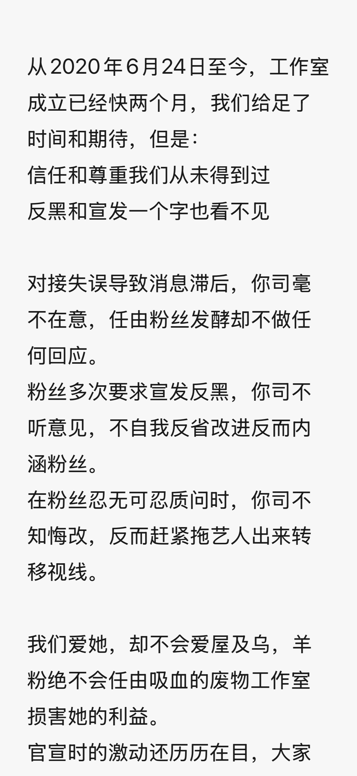 常看常新,自己能力不行,就换粉丝,这么多年还是没改善。工作室不直面自己的问题,换谁都没用。请公司粉丝运营小蓝引咎辞职,并给心动周刊和粉丝会被踢人员道歉!公开工作室成员组成,接受粉丝监督。