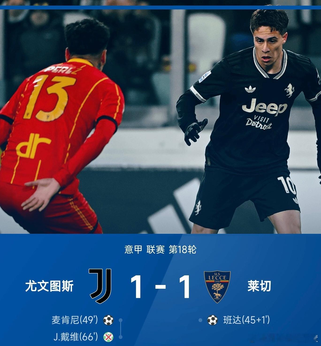 北京时间1月4日,25/26赛季意甲联赛第18轮展开争夺,尤文图斯主场1-1战平莱切。上半场尾声阶段,坎比亚索后场出现失误,莱切球员班达抓住机会破门,客队率先打破僵局。易边再战仅4分钟,麦肯尼禁区内抢点建功,帮助尤文将比分扳为1-1平。第66分钟,戴维制造莱切后卫手球犯规,斑马军团赢得点球良机,可惜戴维亲自主罚的射门被对方门将神勇扑出。此后尤文发动潮水般猛攻,但始终未能敲开对手球门,最终只能接受1-1的平局结果。