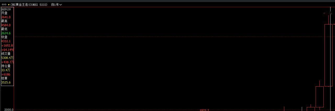 刚刚过去的一年, 也就是2025年, 国际金价连续多次刷新历史新高, 最高更是突破四千五百美元。 当年高开高走, 开盘价为2641美元, 盘中最高升至4584美元, 最低价为2624.6美元, 最终收盘于4332.1美元, 较上一日上涨1692.8美金, 涨幅更是达到64.14%。 虽然黄金处于牛市中, 但是短期上涨过多,存在回调的可能性, 因此期货小褚建议大家观望为主比较好!