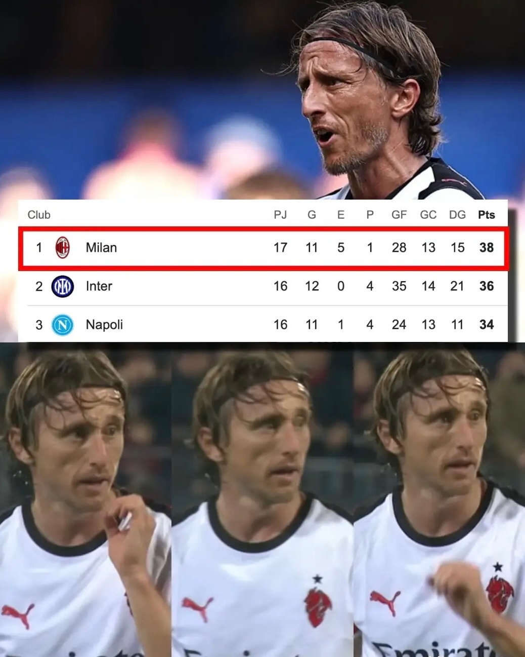 看完意甲积分榜,有三个没想到:第一个没想到是意甲赛程过半,排名第一的居然是AC米兰。米兰虽然意甲顶级豪门,但上赛季仅仅排名第八,想过他们会反弹,但没想到会弹到榜首。第二个没想到的是米兰之所以排名榜首,仰仗的还是40岁的莫德里奇。莫德里奇已经多次拿到全场最佳,依旧从从容容,游刃有余。第三个没想到的是莫德里奇这么大年龄了,居然17场比赛全部首发,并且其中14场比赛踢满了全场。实在想不出来,哪个中场球员在40岁,还能在顶级联赛有这样的出勤率。