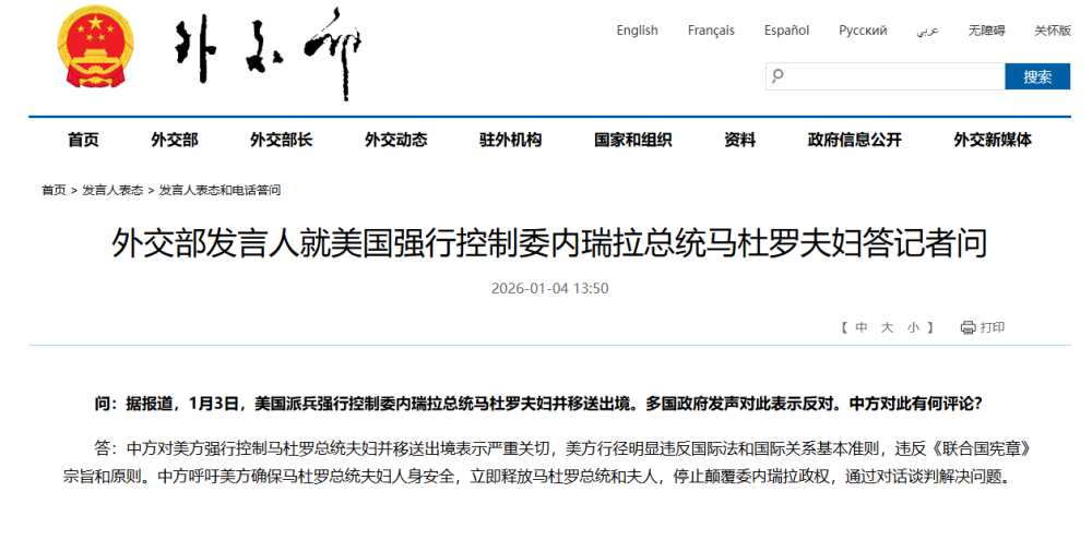 #外交部回应美强行控制委总统夫妇# 【外交部发言人就美国强行控制委内瑞拉总统马杜罗夫妇答记者问】#中方呼吁立即释放马杜罗夫妇# 问:据报道,1月3日,美国派兵强行控制委内瑞拉总统马杜罗夫妇并移送出境。多国政府发声对此表示反对。中方对此有何评论?答:中方对美方强行控制马杜罗总统夫妇并移送出境表示严重关切,美方行径明显违反国际法和国际关系基本准则,违反《联合国宪章》宗旨和原则。中方呼吁美方确保马杜罗总统夫妇人身安全,立即释放马杜罗总统和夫人,停止颠覆委内瑞拉政权,通过对话谈判解决问题。(新华社)