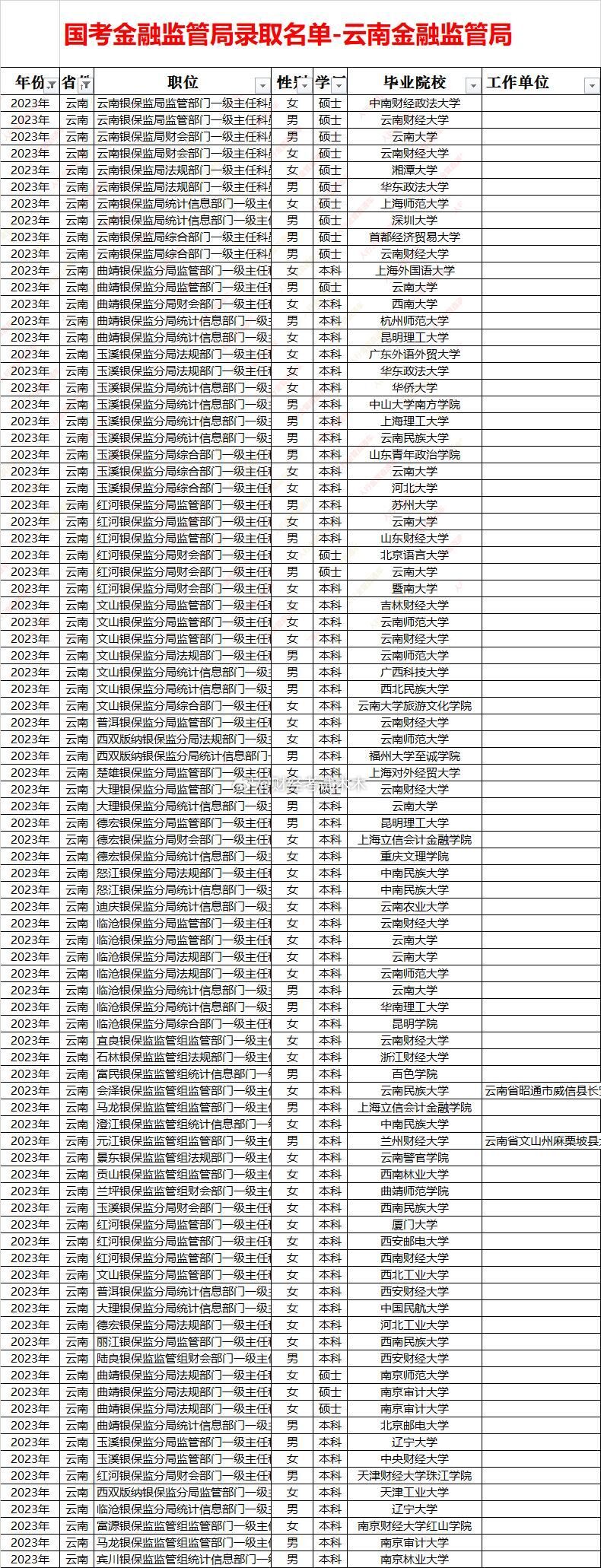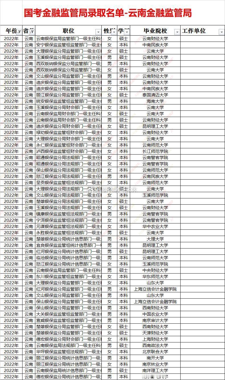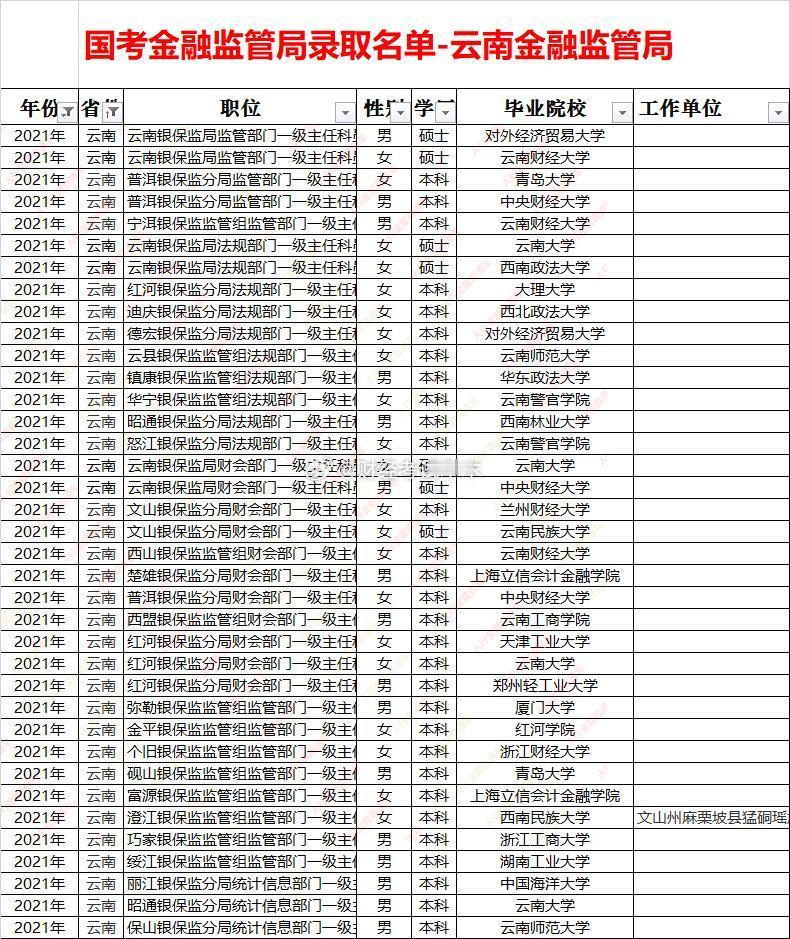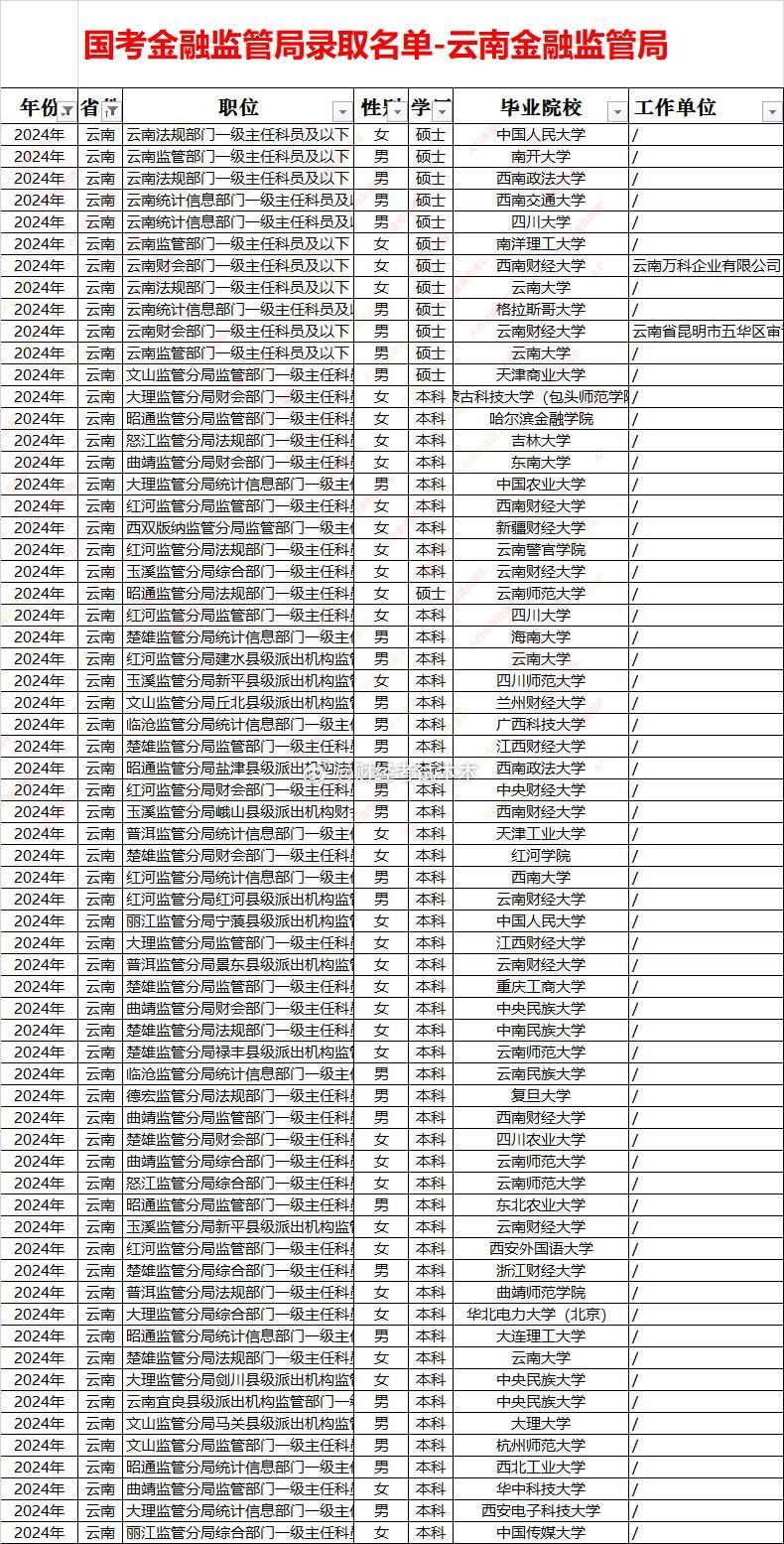 国考金管局云南金监局录取名单面试入围分数线一、招录规模与结构总量:五年累计录取约 340 人,年均 68 人;2025 年峰值 85+,县域监管组占比由 45% 升至 65%,为西南最高。性别:男女≈1∶1.1,女性略多;财会、法规岗女性占比>70%。学历:硕士占比由 48%(2021)升至 72%(2025),海归稳定在 10%;县域组仍以省内本科为主。二、高校层次省内核心:云南大学、云南财经大学、昆明理工——贡献约 50% 生源。省外名校:港大、南洋理工、拉夫堡、人大、南开、中财等硕士主攻省局及昆玉分局。县域组:70% 为省内公办本科(云财、昆工、师大),硕士比例滇东南>滇西北>边疆”四级价差 10-15 分。昆明及省局:所有岗位 60+;曲靖、玉溪、楚雄:55-62;大理、丽江、昭通:50-58;怒江、迪庆、西双版纳、德宏县组:45-52,为西南最低“洼地”。新设监管组(勐腊、贡山、镇康)首年比老局低 8-12 分,形成“低分窗口”。五、趋势硕士化提速:省局 2025 年硕士占比>90%,“双非”硕士进面难度加大。县域扩招:2024-2025 年新增监管组 35+,计算机、综合岗分数线不升反降,仍是“低分上岸”主线。财会岗升温:受 CPA 需求拉动,2025 年滇中县组出现 64+,热度持续但分差缩小,省内一本会计专业即可冲刺。法律岗平稳:法考门槛过滤竞争者,省局高分、县局温和,适合“有证选手”保底。财经岗固化:省局 65+ 成常态,滇中城市群 60+ 区间短期难降,高分考生唯一“红海”。结论:高分突围选省局财会,低分上岸选怒江—迪庆计算机/综合,性价比平衡选大理、玉溪财经。金管局面试 金监局面试 国考金管局面试
