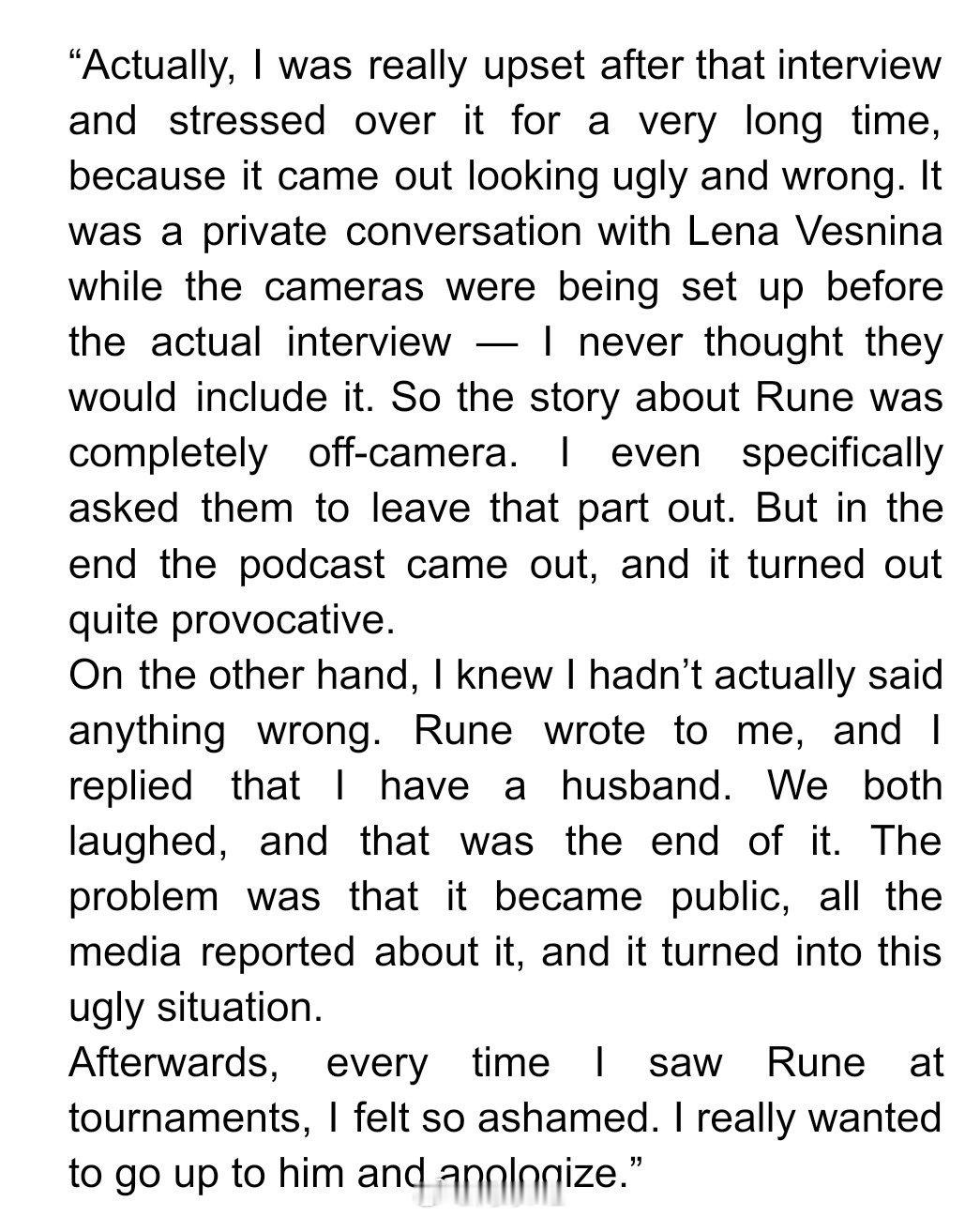 库德梅托娃:遇到鲁内时,想跟他道歉“其实,那次采访之后我特别难受,还为此焦虑了很久,因为内容呈现出来的样子既糟糕又失实。那是我和维斯尼娜在正式采访前摄像机调试时的私下对话——我从没想过他们会把这段放进去。所以关于鲁内的那段话完全是镜头外说的,我甚至特意要求他们把这部分删掉。可最后播客还是发布了,内容还夸大了这件事。但另一方面,我知道自己其实没说什么错话。鲁内给我发过消息,我回复说我有丈夫了,我俩都笑了,这事就这么过去了。问题出在这段对话被公开后,所有媒体都大肆报道,最后演变成了这么一桩难看的事。从那以后,每次在赛事上见到鲁内,我都特别羞愧,真的很想上前跟他道歉。”年度体育榜样力量体育大赏