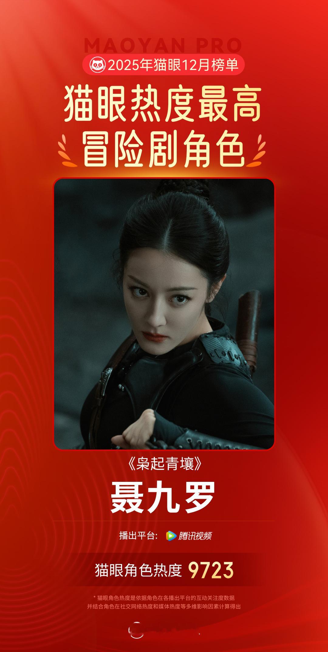 迪丽热巴迪丽热巴聂九罗12月最热冒险剧角色 据猫眼专业版数据,在《枭起青壤》中饰演的“聂九罗”,成为2025年12月猫眼热度最高冒险剧角色🏆!2025年12月猫眼角色热度榜