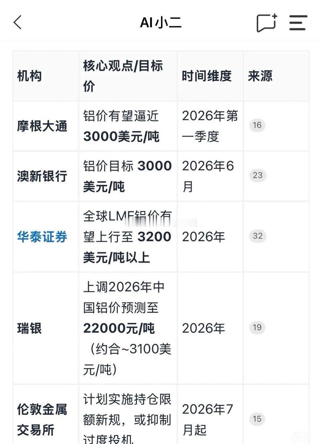 LME铝,突破3000美元/吨👀继金银铜之后,铝价也开始涨了。截至1月3日收盘,伦敦金属交易所(LME)三个月期铝价格收于每吨3,015.50美元,自2022年以来首次突破3000美元大关。(图二)为啥大📈?📈供给端刚性约束是核心支撑国内产能“天花板”明确:中国电解铝行业受4500万吨产能红线约束,新增产能空间极度有限。东吴证券预测,2026年国内电解铝有效新增产能仅59万吨,增速降至1.14%,供给缺乏弹性 。海外供应增长缓慢且存变数:摩根士丹利表示,能源转型导致的电力瓶颈将制约供给,预测2026年全球铝市场将提前陷入短缺。印尼远期产能虽大,但电力配套不足可能阻碍其释放。📉极低库存与高虚实比放大价格弹性全球铝库存持续处于120-125万吨的历史低位,安全边际薄弱。LME库存结构紧张,近月合约持仓量高,虚实比曾接近40倍,存在逼仓风险,加剧价格波动 。🔋需求侧存在结构性亮点能源转型提供长期需求:储能、新能源汽车、光伏等领域对铝的消耗量持续增长。替代需求显现:铜价持续位于高位,使得铝在部分领域的替代经济性提升,间接拉动铝需求。此外,多数机构认为在供需紧平衡格局下,铝价中枢有望维持高位,但对上行空间预测不一。(图三)ps,以上数据仅供参考,不构成任何投资建议。