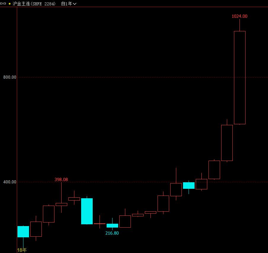 今天是周日, 明天就是新的一个交易周, 同时也是新的一个交易年。 刚刚过去的一年, 国内黄金期货跟随外盘金价波动而波动, 主力连续合约也是大幅飙升, 最高升至1024元。 以年线看,连续四年上涨; 而且近十年中,只有一年是回落的, 九个交易年度是上涨的, 可见黄金处于大牛市中。