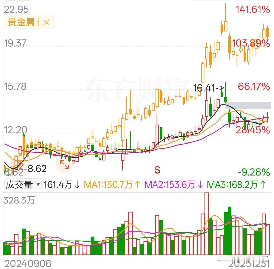 贵金属唯一涨幅大大落后于板块的,基本看上去不错,不知有何暗雷 贵金属板块一共只有11只股票,它是这波行情唯一涨幅不到50%的标的,整个板块都走出翻倍多了。 基本面看,它题材都是去年热点,金、银、稀土、磷化工,这些无不是去年大热门,可是它一个热门都不跟。 财务指标逐步改善,特别是三季报,表现非常强劲。 目前它的市值只有198亿,可是它持有的万国黄金市值就有50亿左右。公司表示根据情况,会减持万国黄金。 唯一不利空就是2015、2016年年报被立案未结案,但是会计差错已更正。利好就是大股东解决同业竞争,会有资产注入。 进入一月份,年报预披露已经开始,正常情况它应该不会差,就是不知道能不能刺激下股价!