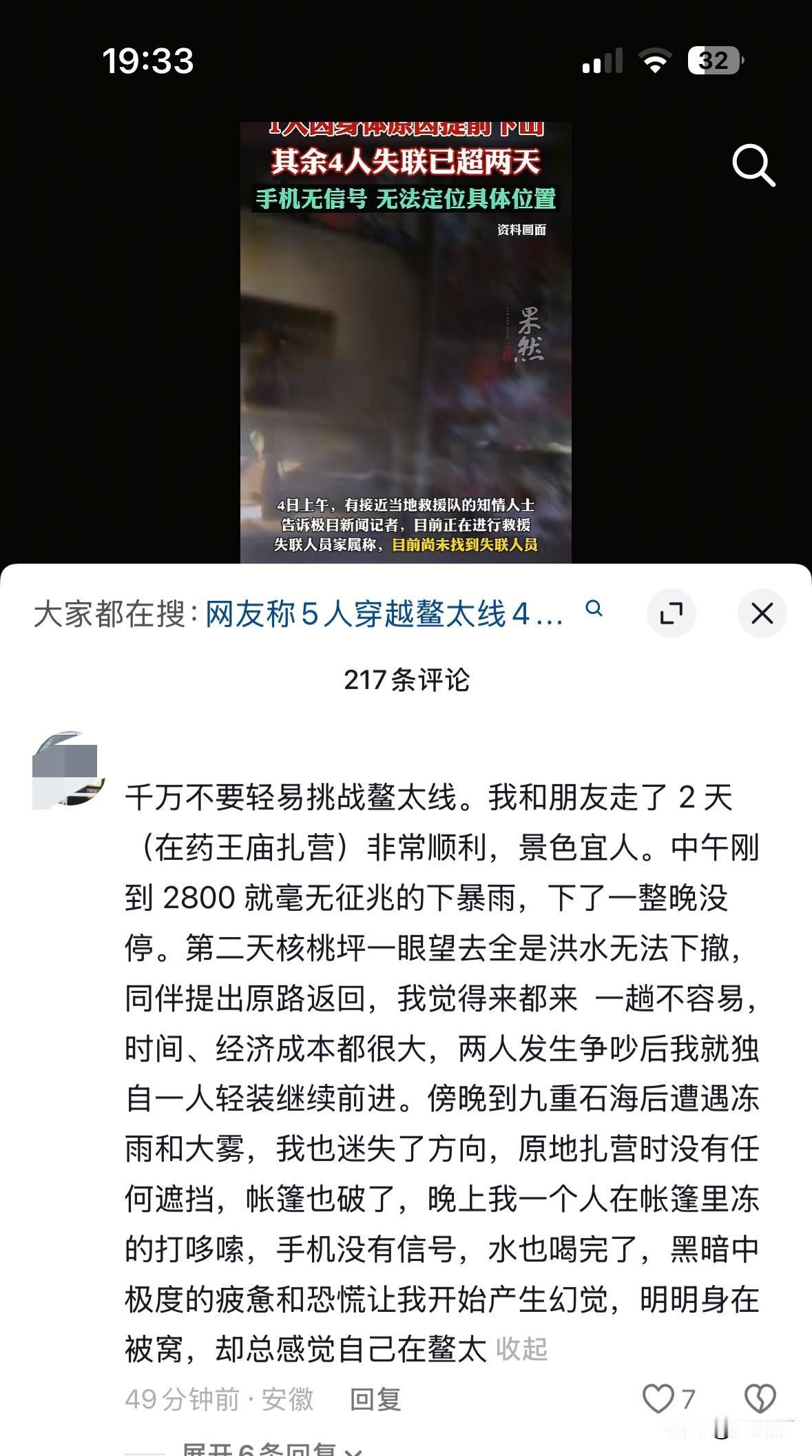 穿越小鳌太线失联的几个年轻人真的太虎了!他们一行4人,在天黑以后从西安包车出发,连夜就摸黑进山了。 那天是一年一度的元旦节,彼时,陕西多地的气温已经降至了零下。在这样的恶劣天气下,山上的情况可想而知,但几个年轻的驴友却依旧坚定不移的做出了穿越小鳌太线的决策。 所谓的小鳌太线,即秦岭山脉鳌太线的简化分支,其徒步距离约40-60公里。看似不远的一段距离,但因海拔高地势复杂,非常不好走。夏天尚且不容易,到了冬天就更难了。因为山路一旦被冰雪覆盖,很容易发生意外。 事实上,早在多年前鳌太线全线就已经禁止徒步穿越,但每年都防不胜防,还是有那么一些人根本无视规则。 或许是太过自信了,也或许是那几位驴友他们根本不明白要在冬日里穿越小鳌太线意味着什么。 当天下午6点多,天已经黑了。4位驴友从西安体育馆包了一辆车子出发,而后又以500元的价格找到了一个本地领队。 当晚10点左右,他们到达了登山口,4个驴友各自同自己的家人报备后就义无反顾跟着领队进了山。 殊不知,这一场所谓的挑战却并没有想象中那么顺利。 他们一行5人中,只有一个因身体不适提前安全下山了,另外的4个全部失联。 截止到现在,救援队成功救回了一个,目前还有三人失联。眼下,那么冷的天气,如果没有被尽快找到,情况是非常不容乐观的。 人的生命只有一次,在那种气温变幻莫测的大山里,稍有不慎就很难回来了。所以,一定要对大自然多点敬畏之心,在零下的气温下摸黑进山实在是不可取! 希望经此一事,他们可以吸取教训,在以后的生活里稳稳当当的,也希望失联的3位驴友们都能尽快平安归来![祈祷][祈祷][祈祷]