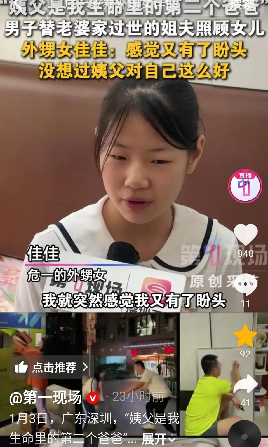 看哭了!广东深圳,12岁女孩的父亲病逝,母亲残疾无力抚养。没想到,她被90后的姨父姨妈领养,她写了一篇作文来感谢姨夫。作文题目是《我的第二个爸爸》。在作文里,她写了离开老家来到姨父家的日常生活。她没想到,姨夫会对她这么好,这让她感觉自己又有了盼头。 在那篇朴实无华的作文里,她用稚嫩的文字,讲述了一个关于温暖与希望的故事。字里行间,满是对姨父姨妈无私关爱的感激,也流露出她那颗渴望被爱的心。她写道:“姨父每天都像对待自己的孩子一样照顾我,无论是学习上的辅导,还是生活中的点滴,都让我感受到从未有过的温暖。”这短短几句话,却道出了一个被困境折磨,却依然相信人性善良的孩子最真切的心声。 你是否曾想过,一个看似普通的家庭背后,隐藏着多少未被人知的故事?在这个社会的角落里,像她一样的孩子每天都在默默承受着失去亲人的痛苦,却依然坚强地寻找一线希望。姨父姨妈的无私,像一束光,照亮了她心中的阴影,也让我们看到了人性中最温暖的一面。 然而,故事的背后,却隐藏着更深层次的社会问题。为什么会有那么多像她一样的孩子,失去了原本应有的家庭温暖?为什么我们身边会有那么多需要被帮助的弱势群体?这不仅仅是一个家庭的故事,更是整个社会的缩影。我们是否在日常的忙碌中,忽略了那些需要我们关心的角落?我们是否可以用一点点行动,为这些孩子点亮一盏希望的灯? 更令人动容的是,这个女孩用她的文字,向我们传递了一个简单却深刻的道理:爱与希望,永远不会缺席。只要有人愿意伸出援手,哪怕是最微小的善意,也能成为他们生命中的转折点。她的作文不仅仅是一份感恩,更是一份呼唤——呼唤更多的人关注那些被遗忘的角落,去传递温暖,去点亮未来。 这篇作文让我们看到了人性中最美好的一面,也提醒我们,每一个微小的善举,都可能成为别人生命中的奇迹。或许,你我都可以成为那个“第二个爸爸”“第二个妈妈”,在他们最需要的时候,给予一份无私的爱。让我们一起,用行动去温暖这个世界,让每一个像她一样的孩子,都能在阳光下,茁壮成长,拥有属于他们的幸福和希望。