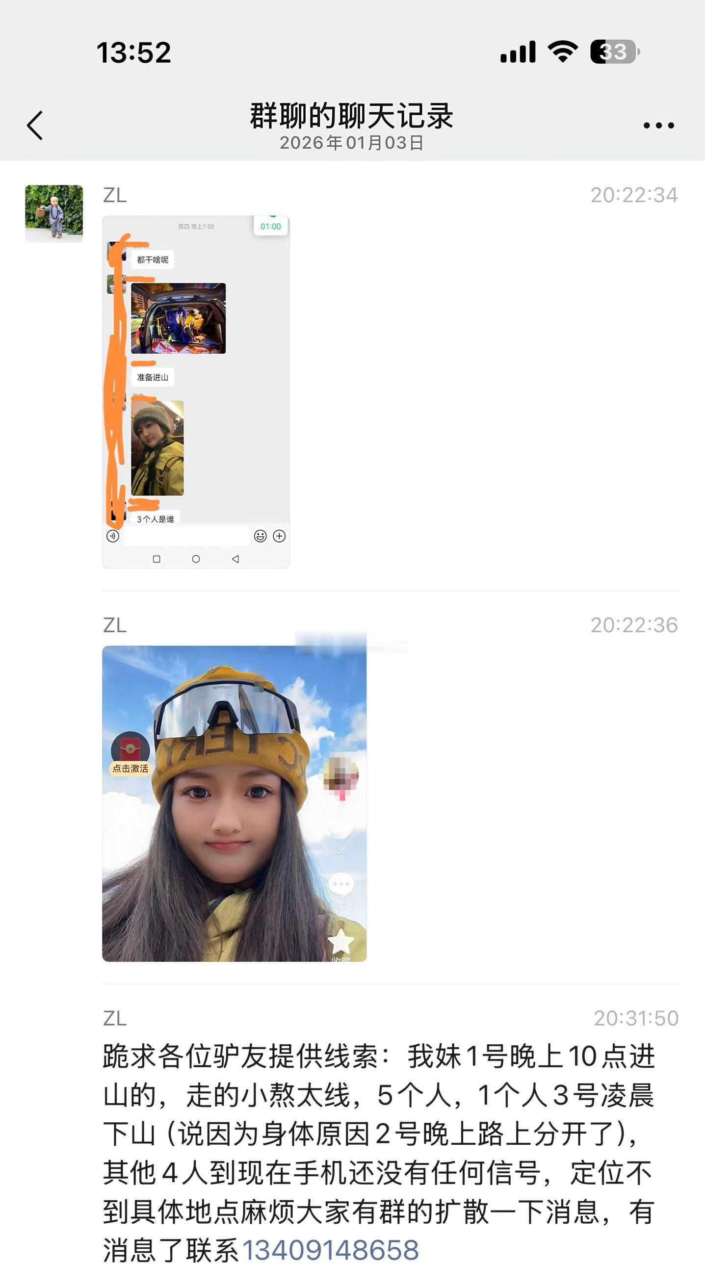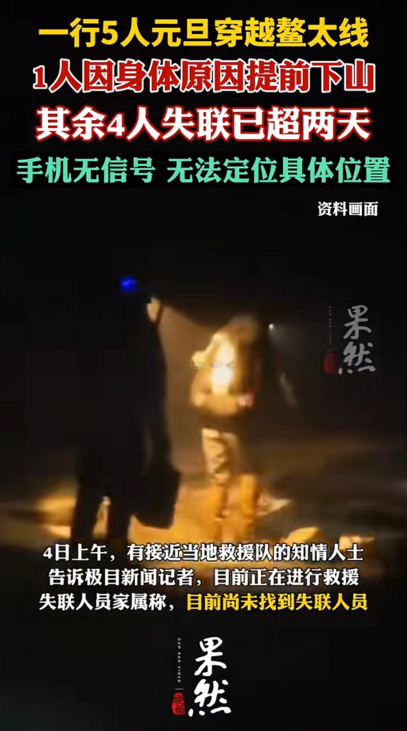 秦岭女生徒步失联,1月1日晚上进山走小鳌太5个人,1个人3号凌晨下山,其他4人到现在手机还没有任何信号。 多人翻小鳌太线失联