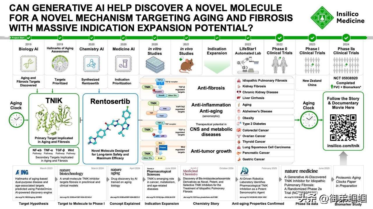 首个由人工智能设计的药物即将进入批准前的最后试验阶段 在人工智能迅猛发展的今天,药物研发领域迎来历史性里程碑!由Insilico Medicine公司完全依靠生成式AI从头发现和设计的药物Rentosertib(原名ISM001-055),被誉为全球首个“纯AI药物”,近日最新进展显示:它在针对特发性肺纤维化(IPF)的2期临床试验中,显著改善患者肺功能,且安全性良好。业内专家预测,该药很可能在未来18个月内进入3期临床试验,这是申请FDA批准前的最后关键阶段。 特发性肺纤维化是一种致命的慢性肺部疾病,目前缺乏治愈手段,现有的治疗药物仅能延缓病情进展,每年导致数万人死亡。Rentosertib针对新型靶点TNIK(一种调控纤维化和炎症的关键激酶),通过Insilico的Pharma.AI平台仅用短短时间便从零设计而出,远超传统药物研发周期。 在2025年发表于《Nature Medicine》的2期a试验中,71名中国IPF患者参与随机双盲对照研究。结果令人振奋;试验还显示剂量依赖性疗效,伴随抗纤维化和抗炎生物标志物支持,且无严重药物相关不良事件。 该药物在不到两年的时间内就进入了人体试验,而通常需要 4 到 5 年,同时风险投资公司在 2025 年前三个季度向 AI 药物开发公司投资了 27 亿美元,全球制药 AI 投资预计到 2034 年将达到 164.9 亿美元。 Insilico Medicine创始人兼CEO Alex Zhavoronkov博士表示:“Rentosertib不仅是AI药物发现的临床验证,更是制药行业进入‘超级智能’时代的开端。” 公司已启动与中国和美国监管机构的讨论,计划2026年上半年在中国启动大型3期试验,同时推进吸入式制剂和肾纤维化适应症研究。 如果Rentosertib最终获批,将成为首个真正由AI“从靶点到分子”独立完成的上市药物,彻底颠覆传统耗时耗资的研发模式,为无数罕见病和难治性疾病患者带来新希望。 AI药物时代,已正式到来!你怎么看这一突破?欢迎评论区讨论! AI医学技术 AI癌症研究 ai医药研发 ai新药研发 AI医药创新 ai新药 ai制药第一股