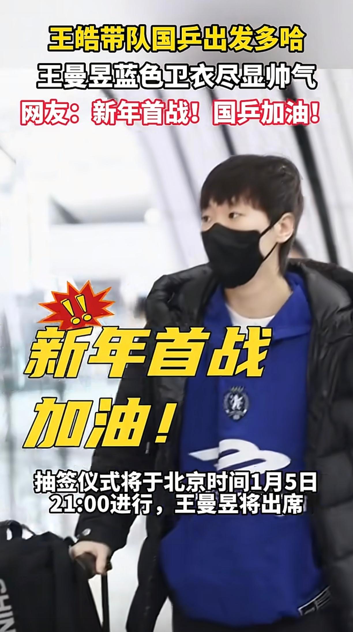 国乒出发多哈冠军赛了,这次是王皓指导带队,王楚钦和孙颖莎因伤缺席,王曼昱、梁靖崑、林诗栋、蒯曼、王艺迪、陈熠等人参赛,新年首战,希望国乒加油,也希望队员们在比赛时注意不要受伤,健康完赛,快乐涨球!(图片来源于网络侵删)