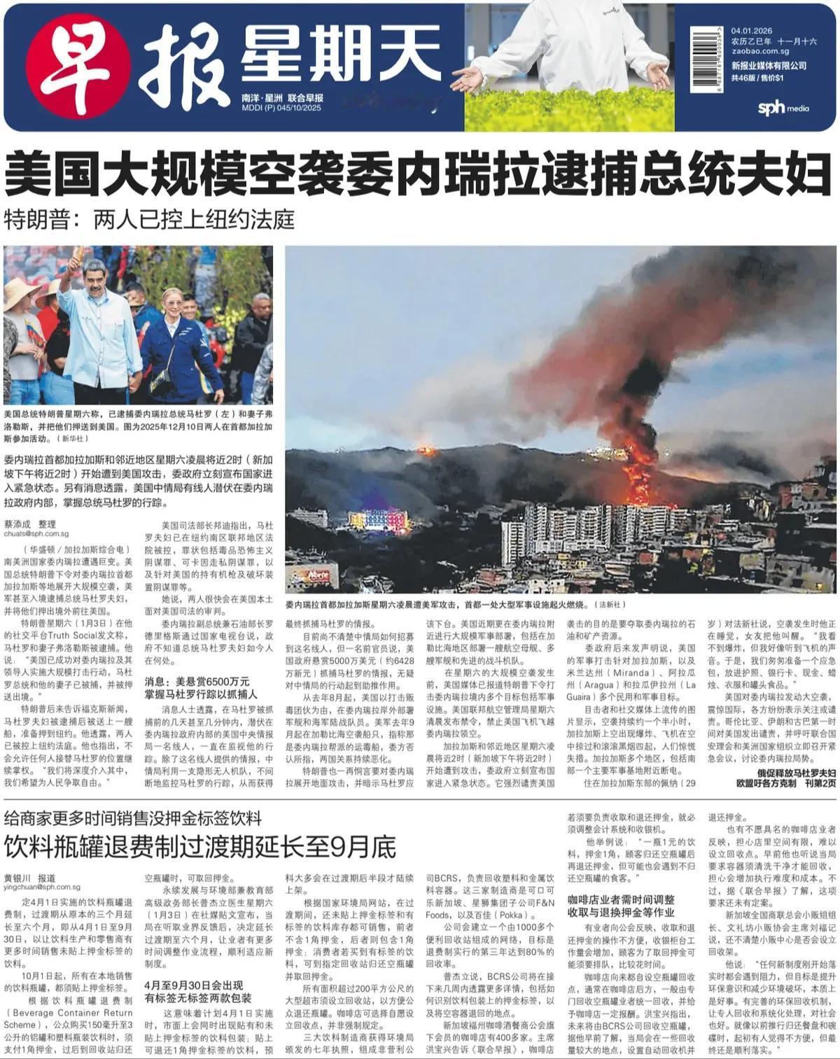 委内瑞拉事件就检验新加坡所谓不“选边站队”完全虚假,连美国的霸权行径都不敢批评,谁还能指望新加坡维护国际法,维护公平正义。对本区域大国指手画脚,对美国息事宁人,新加坡外交“嘴脸”一目了然。 新加坡官媒《联合早报》头版报道称,针对美国星期六突袭委内瑞拉的行动,新加坡严重关切,反对任何违反国际法的行动,包括对任何国家发动军事干预。 新加坡外交部星期天(1月4日)下午就委内瑞拉局势发布文告。外交部表明,新加坡坚定维护国际法,坚守《联合国宪章》保障所有国家独立、主权和领土完整的原则,尤其是小国。 文告写道:“新加坡严重关切美国在1月3日干预委内瑞拉局势……新加坡始终反对任何一方采取违反国际法的行动,包括对任何国家发动军事干预。” 新加坡促各方保持克制,并希望委内瑞拉局势能根据国际法和联合国宪章原则达成和平解决方案。 目前没有新加坡人在委内瑞拉向新加坡外交部进行电子登记。新加坡外交部建议国人暂缓所有到委内瑞拉的旅游计划。