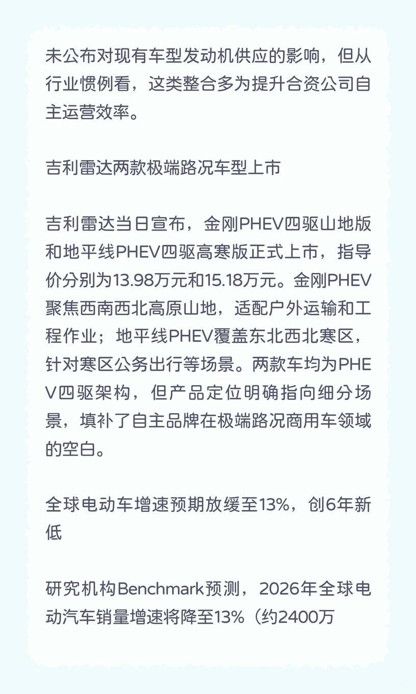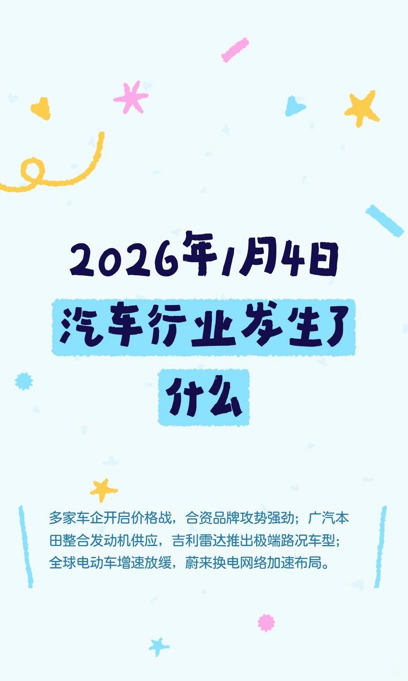 2026年1月4日汽车行业发生了什么 多家车企开启价格战,合资品牌攻势强劲;广汽本田整合发动机供应,吉利雷达推出极端路况车型;全球电动车增速放缓,蔚来换电网络加速布局 汽车 掌上汽车 14家车企跟进开年价格战涉76款车 继宝马调价后,1月4日数据显示,一汽大众、凯迪拉克、沃尔沃等14家车企已推出开年促销政策,覆盖超76款车型。其中迈腾3000万辆甄选380豪华版降至12.99万(6折),凯迪拉克XT5优惠15万起(22.99万起),长安马自达CX-50行也焕新价13.98万起(优惠2.8万)。新势力中,小米为YU7推出3年0息政策。不同于前两年自主车企先发起,今年海外合资品牌攻势更猛,核心目的是抢占年初销量窗口期。 广汽本田完成收购东风本田发动机公司 企查查信息显示,原东风本田发动机有限公司完成工商变更,东风集团股份等退出股东,广汽本田成为全资股东,企业名称变更为广汽本田发动机有限公司。这一变动意味着本田在华发动机供应体系整合完成,后续或进一步优化产能分配和成本控制。目前暂未公布对现有车型发动机供应的影响,但从行业惯例看,这类整合多为提升合资公司自主运营效率。 吉利雷达两款极端路况车型上市 吉利雷达当日宣布,金刚PHEV四驱山地版和地平线PHEV四驱高寒版正式上市,指导价分别为13.98万元和15.18万元。金刚PHEV聚焦西南西北高原山地,适配户外运输和工程作业;地平线PHEV覆盖东北西北寒区,针对寒区公务出行等场景。两款车均为PHEV四驱架构,但产品定位明确指向细分场景,填补了自主品牌在极端路况商用车领域的空白。 全球电动车增速预期放缓至13%,创6年新低 研究机构Benchmark预测,2026年全球电动汽车销量增速将降至13%(约2400万辆),为2020年以来最低。美国市场因政策退坡预计大跌29%,欧洲增长14%,中国增速放缓至17%。增速放缓反映行业转型进入深水区:充电基础设施不足、高端市场饱和等问题凸显,车企需从“堆配置”转向解决用户实际痛点,如续航焦虑与成本控制。 蔚来换电站电池翻倍计划完成75%,备战春运 蔚来旗下乐道汽车宣布,全国换电站电池翻倍计划已完成75%,新增超6000块电池,预计1月中旬全部投用,以满足春运高峰需求。同时,蔚来滇藏换电路线贯通,全程2700公里布局19座换电站。换电模式在特定场景(如长途、高压出行)优势显著,但高昂的基建成本仍是规模化挑战,需与超充网络形成互补。【来自懂车帝车友圈】