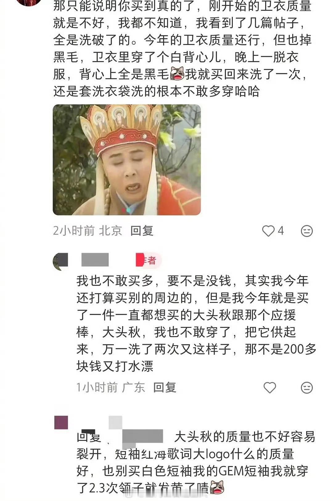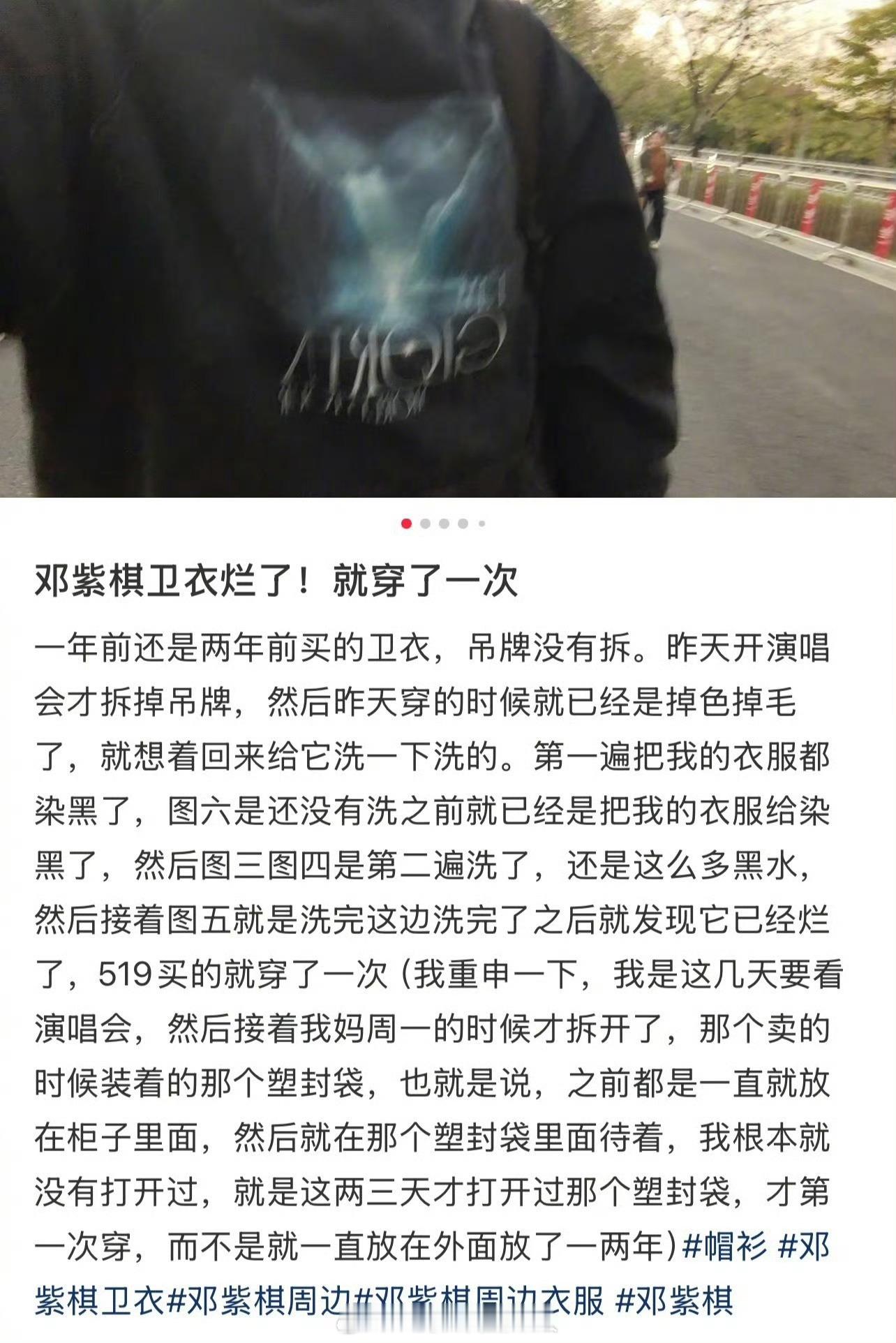 网友发文称邓紫棋卫衣第一次穿就掉色掉毛,洗了两遍给地都染黑了,后面洗完衣服直接烂了,不过我还蛮好奇的这衣服得添加了多少染色剂才能把地整成这个样子?