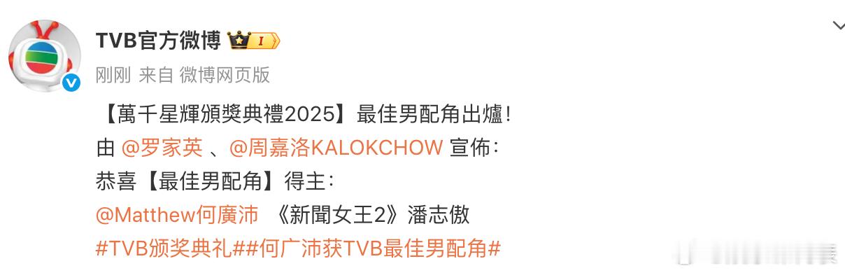 何广沛TVB最佳男配角 凭借《新闻女王2》潘志傲一角获得TVB最佳男配角奖。恭喜床宝!