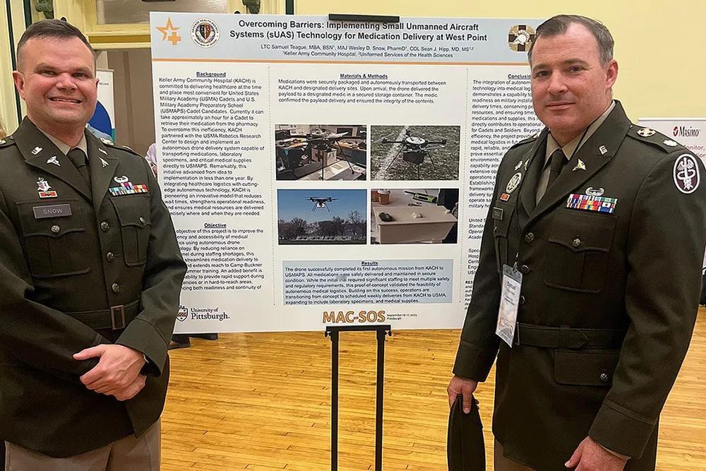 美军开始研究运用无人机支持军事后勤运输相关技术。 美军凯勒陆军社区医院药学部主任韦斯利·斯诺少校和初级保健部主任塞缪尔·蒂格中校于2025年9月16日至17日在匹兹堡大学举行的“医学自主护理-科学现状会议”上展示了题为《克服障碍:在西点实施小型无人机系统(sUAS)技术用于药物输送》的研究海报。该演讲展示了凯勒与美国军事学院机器人研究中心(隶属于电气工程与计算机科学系)的合作,通过无人机向缺乏现场医疗设备的美国军事学院预备学校学员候选人递送药物。