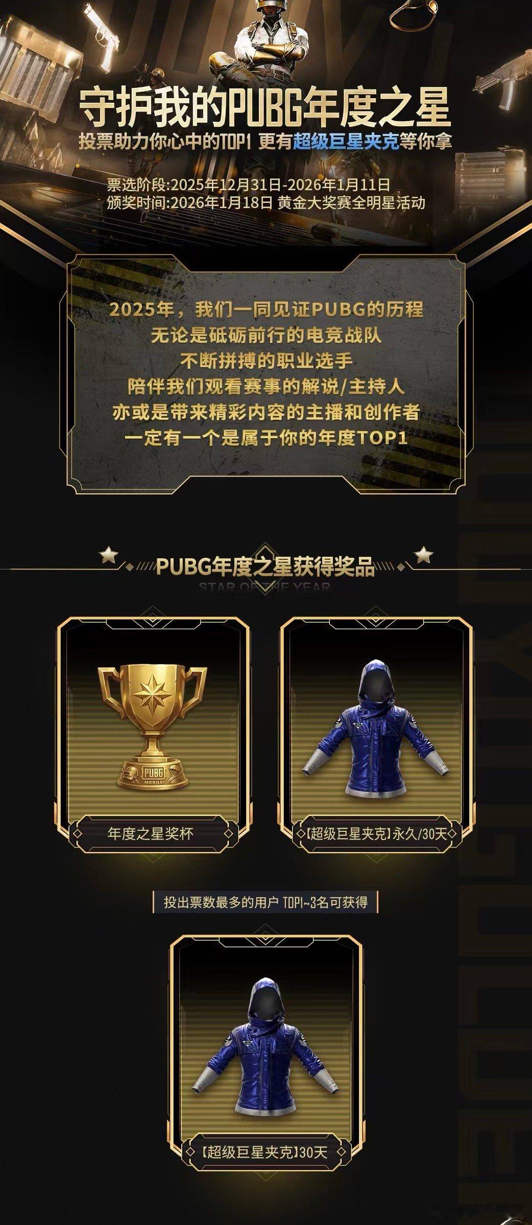 2025PUBG年度投票2025PUBG年度之星认准这款夹克,百分百是职业级别的!这两天鱼台的年度选手、战队投票正式启动,第一名的专属奖励就是超级巨星夹克!