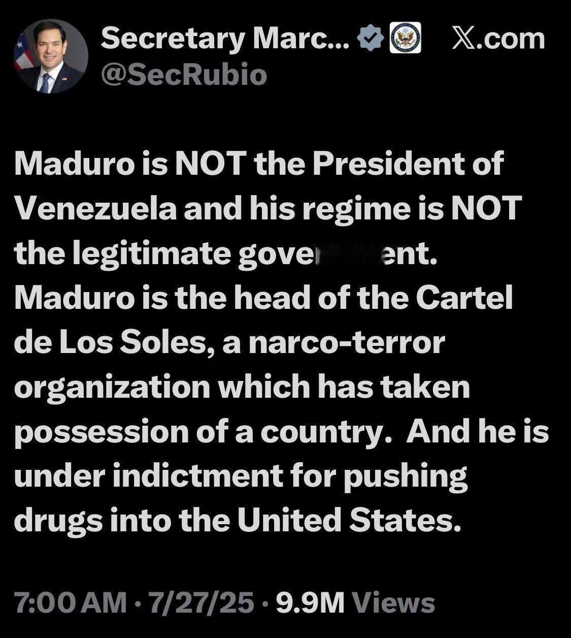 美国绑架了委内瑞拉总统马杜罗。国务卿鲁比奥发帖谎称马杜罗不是委内瑞拉总统,他的政
