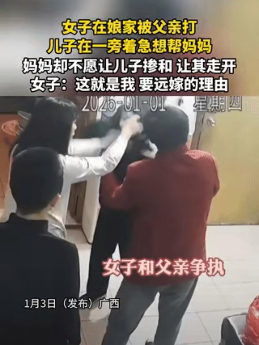 “彻底乱了套了!”广西一女子回娘家时,因和父亲产生矛盾,不料,父亲情绪激动要动手打女子。俩人在拉扯期间,女子儿子见状着急上去帮自己的母亲,结果,被母亲用身体一直顶着,目的就是不想让儿子掺合,一直劝儿子离远点!网友:“儿子可以拉架,但不能参与打架” 女子今年32岁,嫁在邻市,平时隔三差五就会带着孩子回娘家看看。这次回去本是想跟父亲商量弟弟结婚的彩礼事宜,她知道家里条件一般,主动提出帮衬三万块,可父亲却不满足,说隔壁家女儿嫁得好,给娘家拿了十万,指责她自私、不顾娘家,越说越激动,抬手就想往她身上招呼。女子下意识往后躲,拉扯间眼泪就掉了下来——她不是舍不得钱,是觉得父亲的指责太伤人,自己这些年里里外外帮衬娘家的心思,在父亲眼里竟一文不值。 她死死护着身后的儿子,那孩子才八岁,吓得脸都白了,攥着妈妈的衣角直哭,嘴里喊着“外公别打妈妈”。女子一边往后退,一边哽咽着劝儿子:“别过来,妈妈没事,你站远一点”。她心里清楚,父亲是气急了才失了分寸,可孩子还小,不能让他亲眼看着外公和妈妈动手,更不能让孩子觉得“打架能解决问题”。这份护犊的本能,藏着她作为母亲的清醒,也藏着对亲情最后的不舍。 谁都看得出来,这矛盾不是一时兴起。女子后来在私下里说,父亲一辈子强势,家里大小事都要听他的,以前她没结婚时,就常因为意见不合被父亲训斥,嫁人后以为能缓和,没想到还是逃不过“被要求”的命运。弟弟结婚要彩礼,父亲第一时间想到的不是和儿子商量,而是向女儿施压,仿佛女儿的付出是天经地义。这种“原生家庭的付出绑架”,其实在很多家庭都存在。父母总觉得子女是自己养大的,就该无条件服从、无底线回馈,却忘了子女长大后也有自己的家庭、自己的难处,亲情从来不是单方面的索取,更不是用暴力就能维系的。 女子顶着父亲的拉扯护着儿子的样子,让人看着心疼。她不是不委屈,不是不想争辩,可她更怕矛盾升级,怕给孩子留下心理阴影,怕这一巴掌下去,父女情分就真的断了。网友说“儿子可以拉架,但不能参与打架”,这话没错,可在孩子眼里,妈妈被欺负了,第一反应就是保护妈妈,这份纯粹的孝心无可厚非。真正该反思的,是这场矛盾背后的沟通缺失和观念错位。 为什么最亲的人之间,反而容易用最伤人的方式沟通?父亲觉得女儿“不孝”,女儿觉得父亲“不体谅”,说到底,是双方都站在自己的立场考虑问题,忘了坐下来好好说话。父亲习惯了用强势的态度表达期待,却忽略了女儿的承受能力;女儿想着尽己所能帮衬,却没意识到父亲心里的“面子焦虑”。可再深的矛盾,也不该用动手的方式解决,尤其是在孩子面前,长辈的言行举止,会悄悄影响孩子对亲情、对沟通的认知。 亲情是世间最珍贵的羁绊,却也最容易因为误解和强势产生裂痕。作为父母,不该把子女的付出当作理所当然,更不该用暴力摧毁子女的孝心;作为子女,或许也该多些耐心,试着理解父母辈的观念局限。但无论如何,暴力永远是下下策,沟通才是化解矛盾的钥匙。 各位读者你们怎么看?欢迎在评论区讨论。