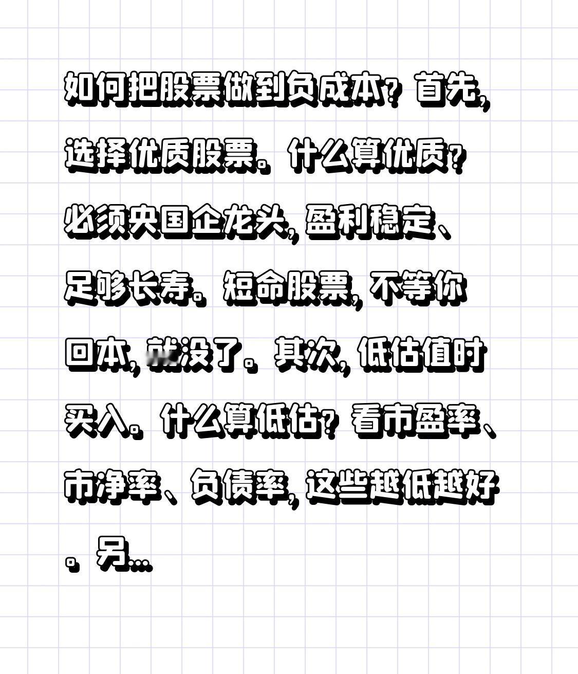 如何把股票做到负成本? 首先,选择优质股票。什么算优质?必须央国企龙头,盈利稳定、足够长寿。短命股票,不等你回本,就没了。 其次,低估值时买入。什么算低估?看市盈率、市净率、负债率,这些越低越好。另外,看股息率、净资产收益率,这些越高越好。 接下来,就是长期持有,分红复投+大波段买卖。怎么看大波段?持有久了,就熟悉了。 股票投资小技巧 股票稳赚战法 巴菲特价值投资的精髓是什么?