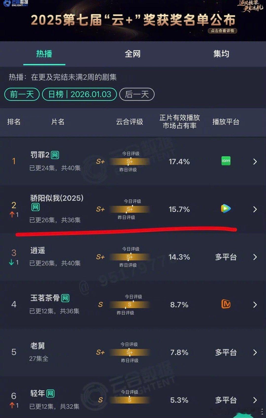 赵今麦、宋威龙的《骄阳似我》大概是有史以来,云合热度与站内热度差距最大的一部剧。站内热度已经破了30000,而单日云合4000w左右,最终热播期集均大概率2000w左右。而鹅上一部热度热度破3w的剧是赵露思的《许我耀眼》,破3w时的当日云合是5500w,最终热播期集均6328w。骄阳似我云合 龙麦