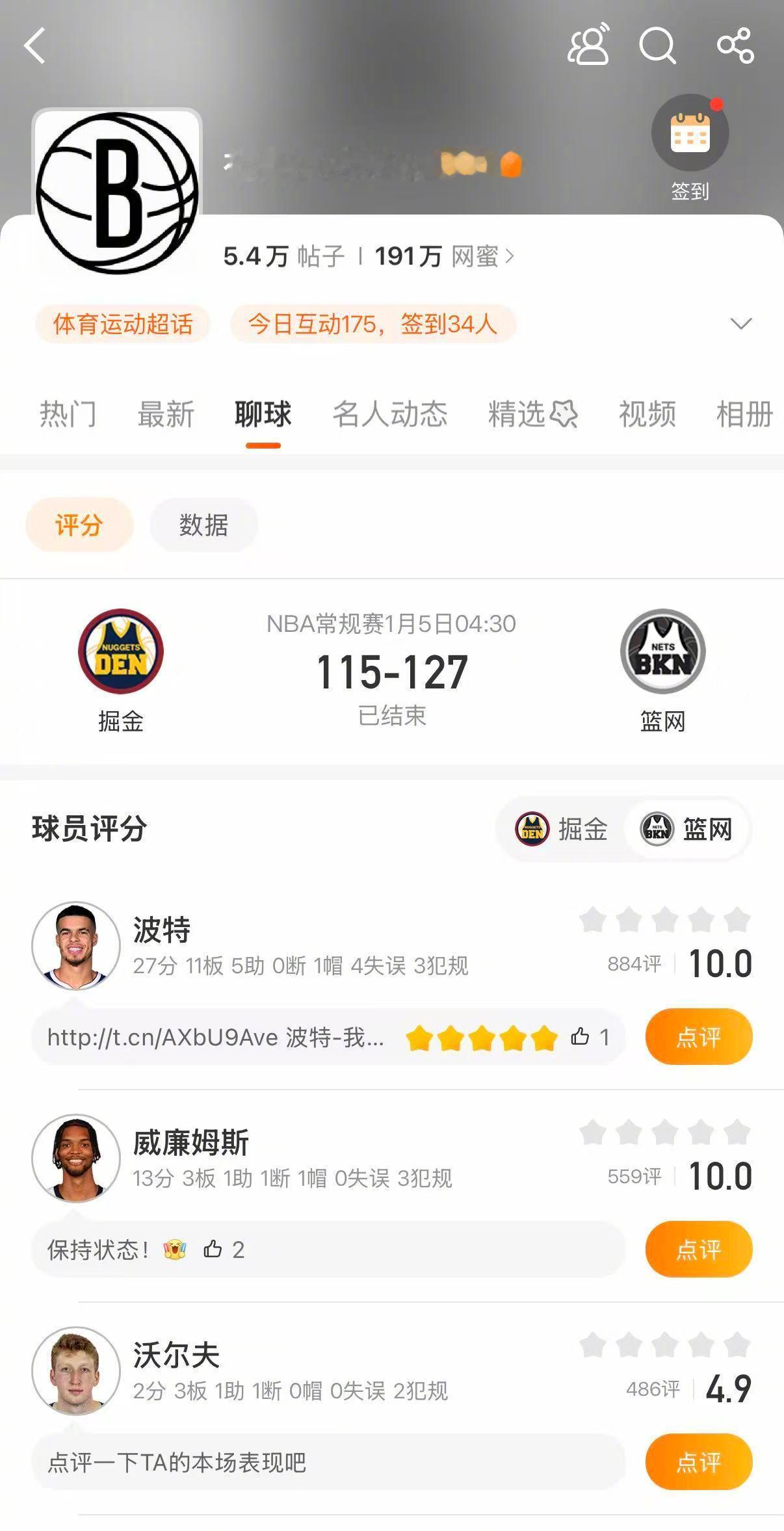 篮网战胜掘金 篮网127-115战胜掘金。波特27分11篮板5助攻,克劳尼22分6篮板2助攻,夏普17分。掘金方面,穆雷27分,哈达威26分,戈登20分。欢迎进入球队超话布鲁克林篮网 与丹佛掘金 对球员表现进行评分!
