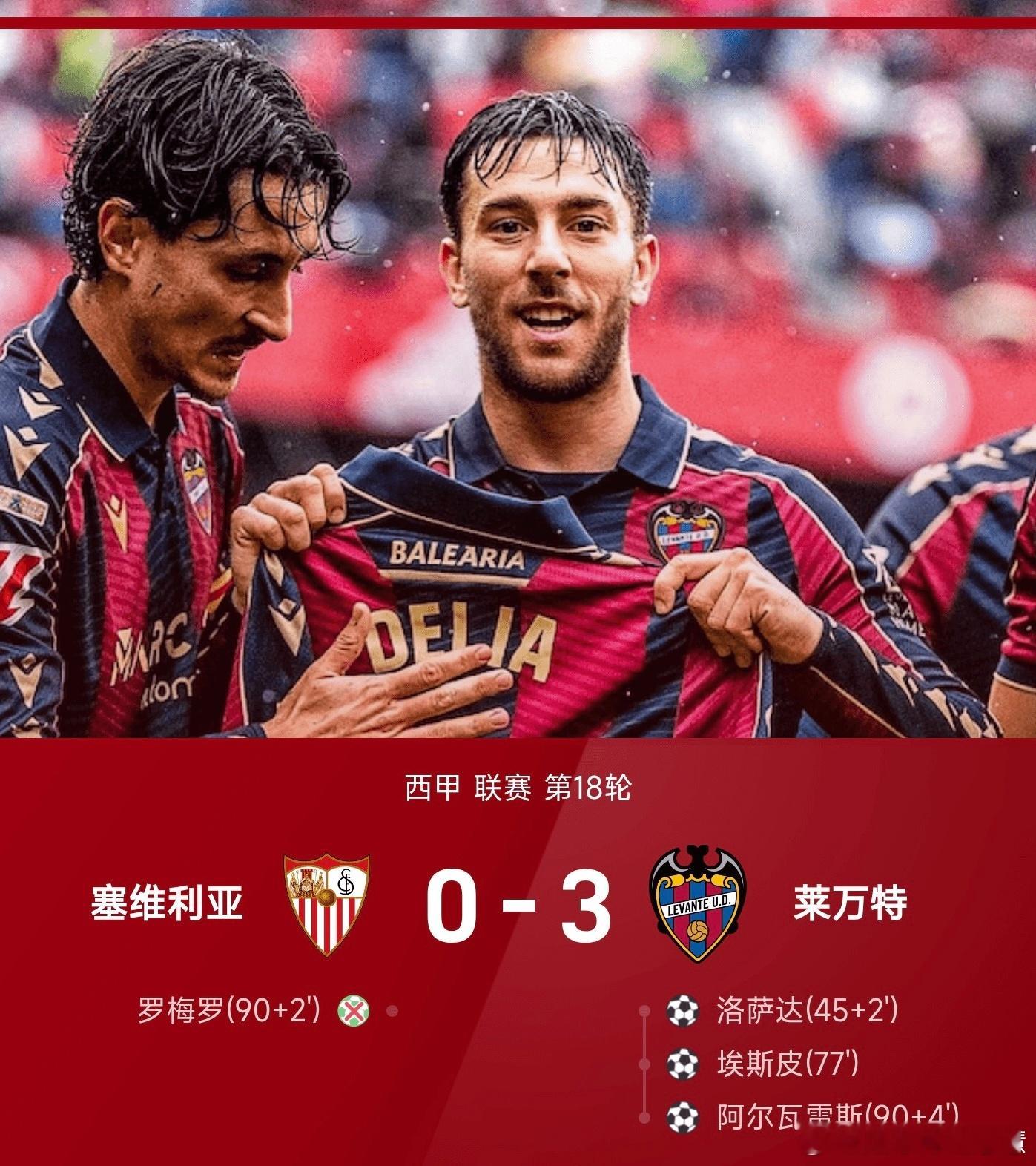 01月04日讯 25/26赛季西甲联赛第18轮,塞维利亚坐镇主场迎来莱万特的挑战。半场尾声阶段,洛萨达低射破门为客队打破僵局;易边再战,埃斯皮门前包抄建功扩大领先优势,阿尔瓦雷斯则完成弑杀旧主的进球,将比分锁定为3-0。比赛尾声,塞维利亚前锋伊萨克-罗梅罗主罚点球,却被莱万特门将瑞恩上演两连扑的神级表现拒之门外。最终,莱万特客场完胜塞维利亚,全取三分。