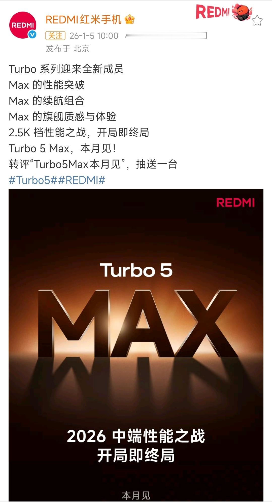 数码闲聊站 REDMI Turbo 5 MAX预热,本月见!中端性能之战,首发D9500s,够强够Max,期待一下!