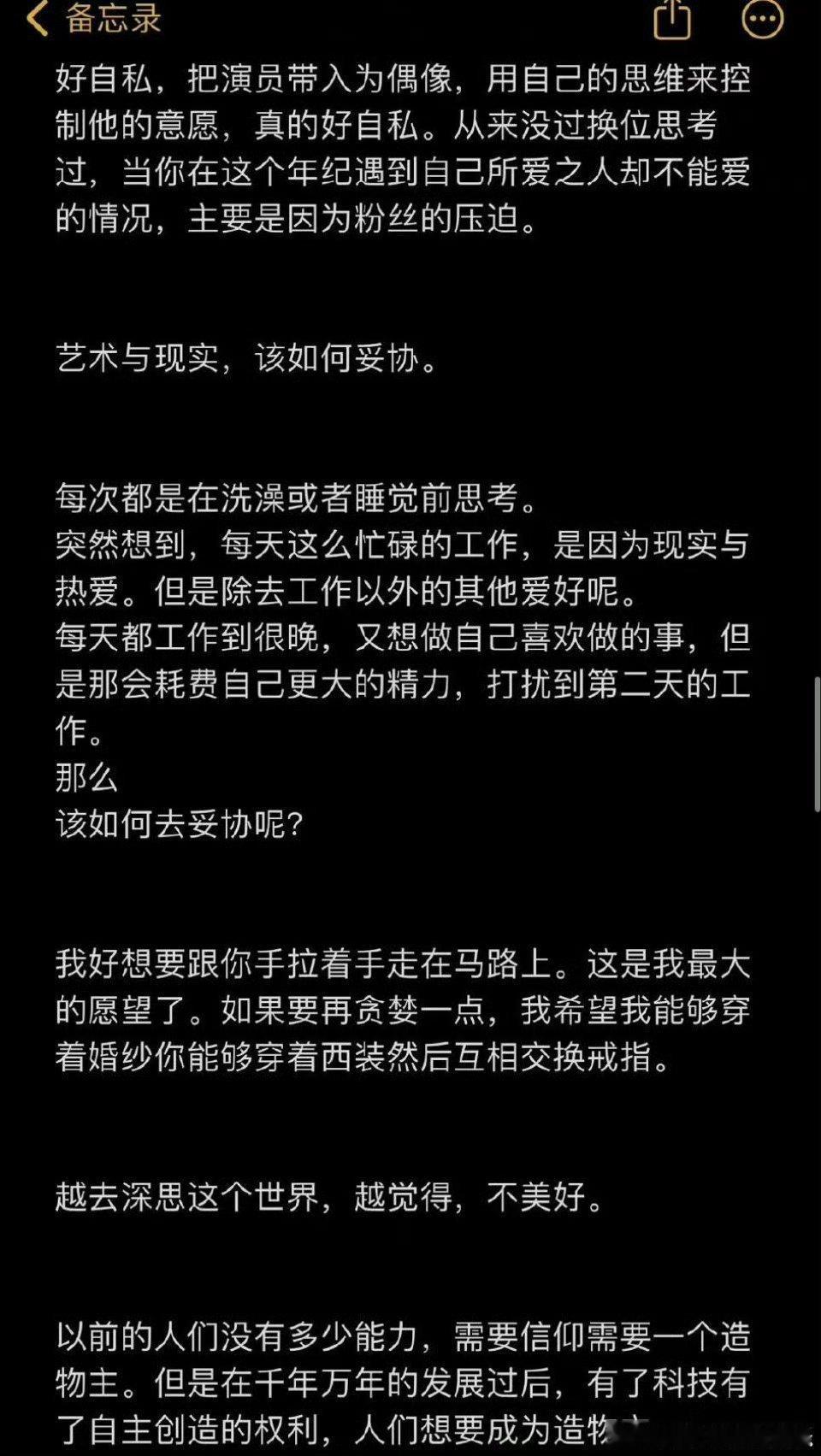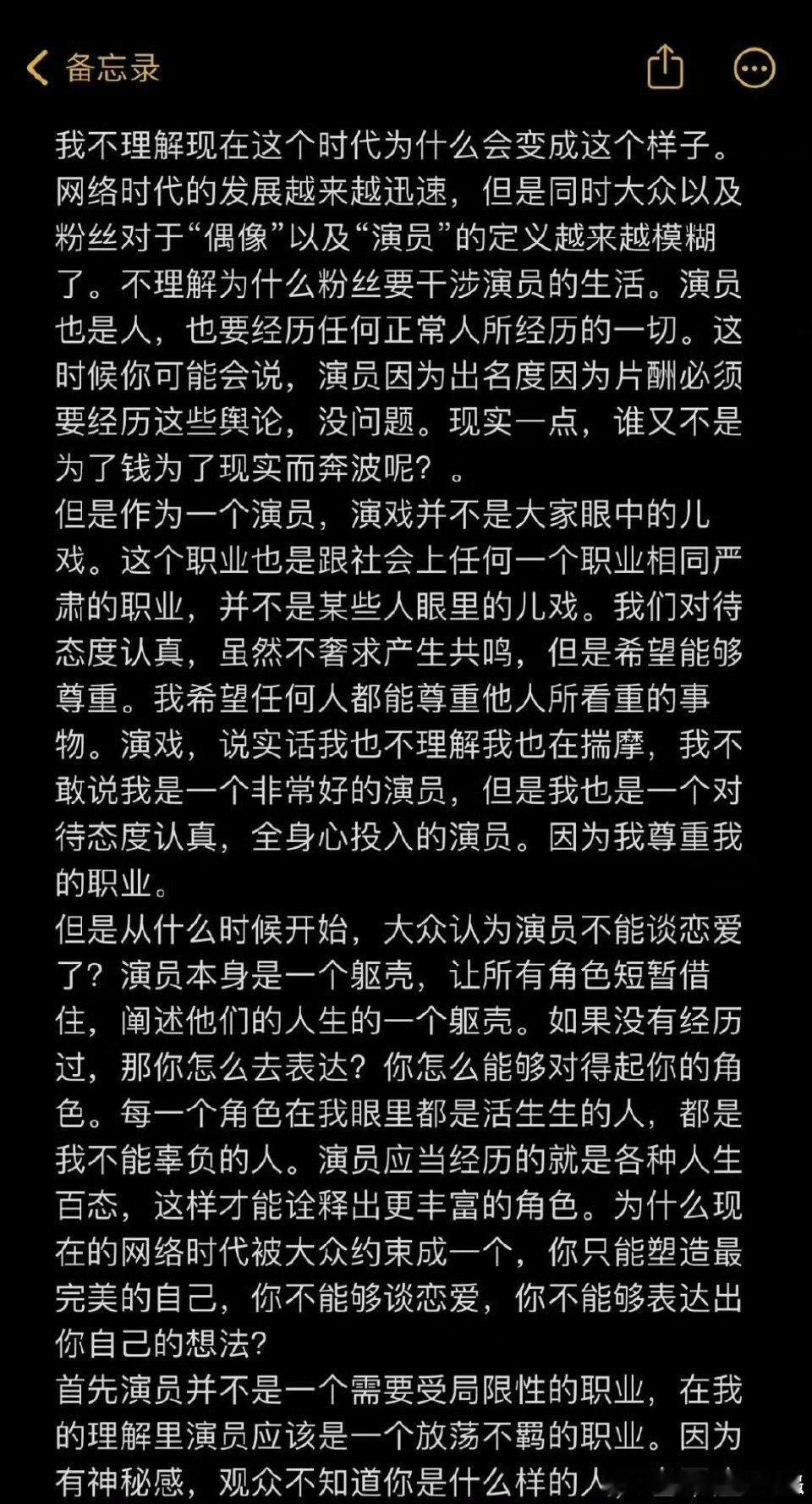 向涵之 备忘录家人们 记不记得向涵之22年发备忘录...以下节选自新浪娱乐:“向涵之晒出备忘录,内容大致是:她认为演员可以恋爱,粉丝不应该干涉演员的生活,“我好想要跟你手拉着手走在马路上。如果要再贪婪一点,我希望我能够穿着婚纱你能够穿着西装然后互相交换戒指。”引发热议后,她晒出一篇文章疑似回应。