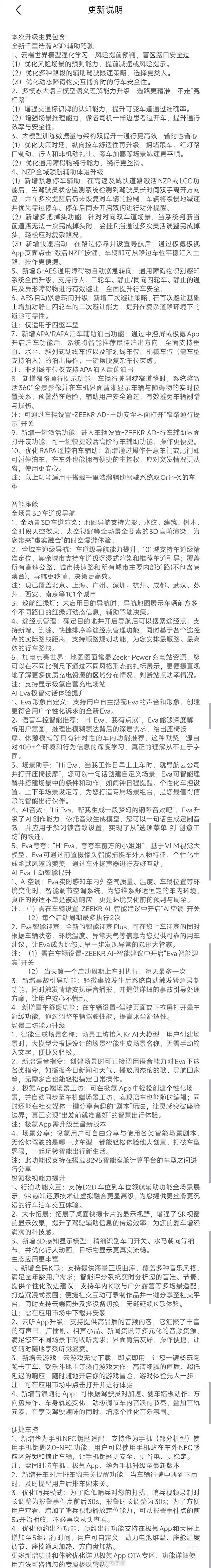 极氪汽车推送 OS 6.7 重磅更新。核心亮点包括:-全域 3D 车道级导航覆盖101城所有道路;-全新“千里浩瀚 ASD”辅助驾驶引入云端世界模型与大语言模型,决策更类人、避障更丝滑;-新增紧急停车辅助、多把掉头、一键激活等实用功能;-AI 助手 Eva 支持形象/声音自定义与场景深度理解。车机生态同步拓展全民 K 歌、云游戏等应用。极氪308_IO新能源汽车