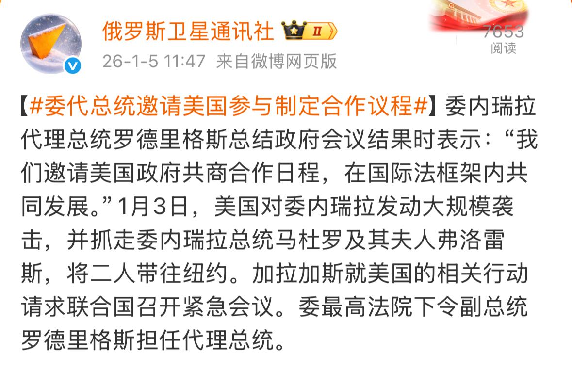 委内瑞拉代总统罗德里格斯正式邀请美国共商合作议程。据俄罗斯卫星通讯社报道,罗德里格斯在总结会议结果时表示,“我们邀请美国政府共商合作日程,在国际法框架内共同发展”。 在马杜罗被捕后,罗德里格斯女士发表电视讲话,她把美国的行动称为前所未有的侵略,她要求美国释放马杜罗夫妇。她呼吁民众冷静团结,共同保卫国家,捍卫自然资源。她表示委内瑞拉最明确的就是再也不会任人奴役。