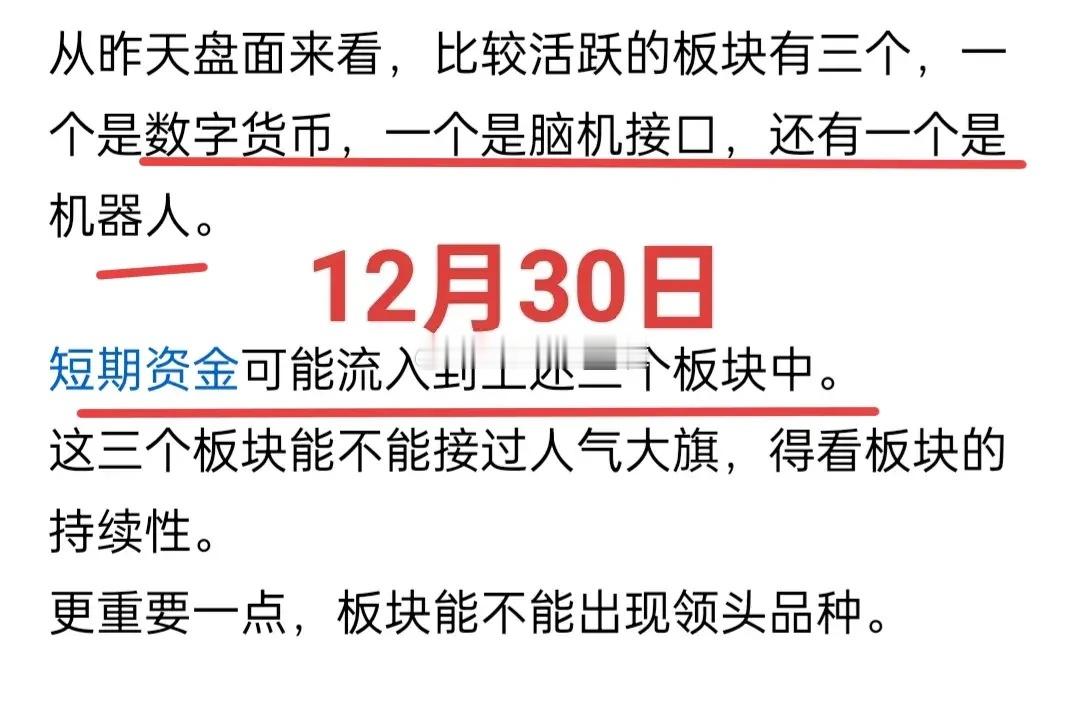 A股:脑机接口板块的爆发,并非无迹可寻,渔夫12月30日提到过这个板块。成交量先行,是这类板块给投资者的重要提示。金姐12月25日午评的时候,提到过数字货币板块。当时该板块有几个标志性股个股,底部成交量较前期放大明显。那一周,数字货币板块消息频出,板块个股表现也是可圈可点(卡拉三个交易日涨幅超20%)同样的戏码又出现在脑机接口板块。脑机接口板块节前也出现了成交量放大的现象,这为今天板块大涨奠定了基础。PS:金姐12月30日提示过脑机接口板块当然,也许有投资者会把板块的上涨归功于消息刺激。实际上,对于机构们来说,消息来源远远强于普通投资者!机构们不会无缘无故的把资金砸向无法兑现的板块(个股)。这类股票,并不是难以抓到。成交量放大,就是这类板块个股启动或者说发力的特征。提前潜伏,比追涨要安全许多……个人观点,仅供交流,不构成投资建议!理财有风险,投资需谨慎!