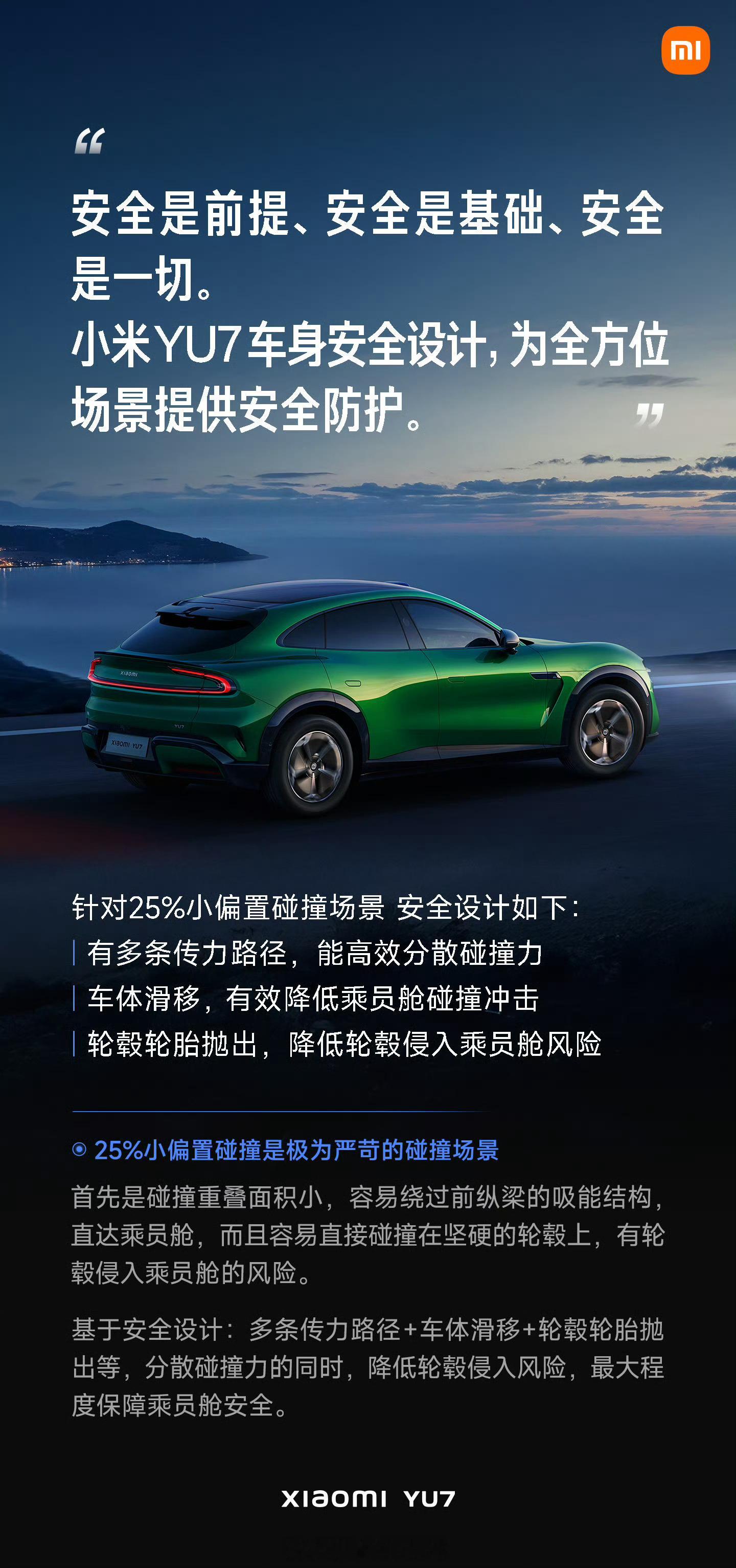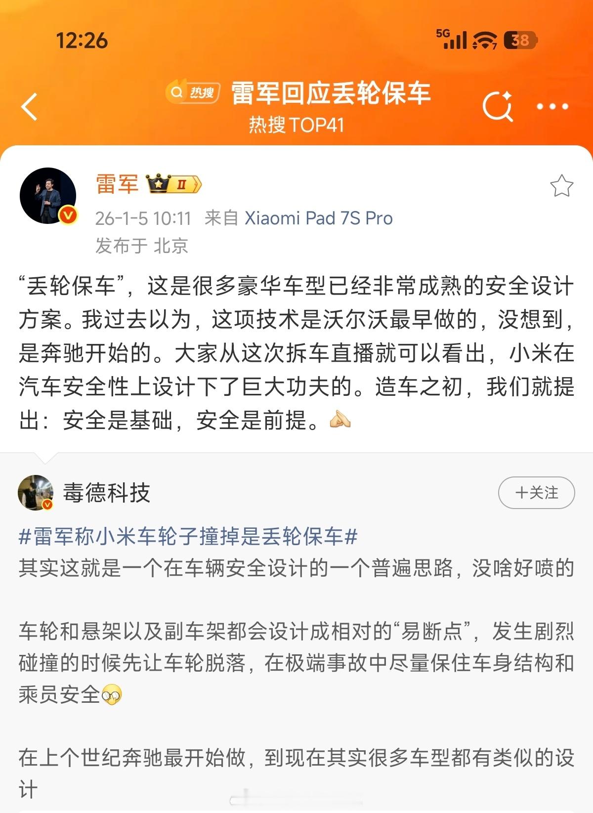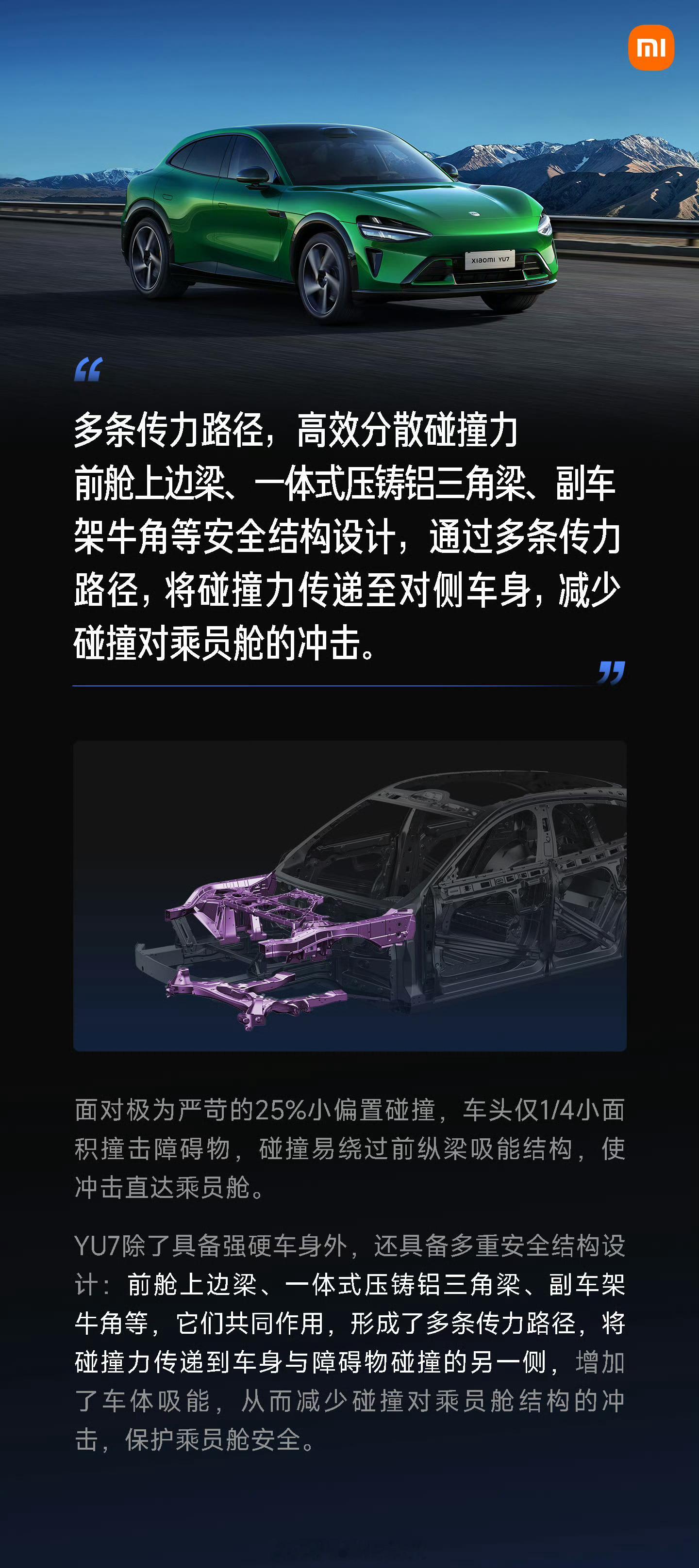 雷军回应丢轮保车 丢轮保命(官方叫碰撞车轮预设脱离)是沃尔沃等豪华车型的成熟安全设计方案,早在十几年前就有的。小米YU7针对25%小偏置碰撞设计:悬架设预设断裂点,高强度撞击时车轮外抛,避免坚硬轮毂刺入乘员舱,同时分散冲击力,实测能减40%乘员舱变形,A柱不变形、车门可正常开,以上说的这些都是经过中保研验证的,经得起“实战”考验。日常触发门槛极高(仅64km/h以上高强度偏置碰撞),颠簸/小剐蹭绝不会触发,和“断轴”、“平地崴脚”完全两码事。然而大多数人对汽车安全的固有印象就是“撞不掉才结实”,那些水军故意只放事故掉轮视频片段,隐去技术原理,就喜欢利用信息差带偏路人。恶意曲解,断章取义,这种内容应该共同抵制,还大家一个清朗的网络空间。