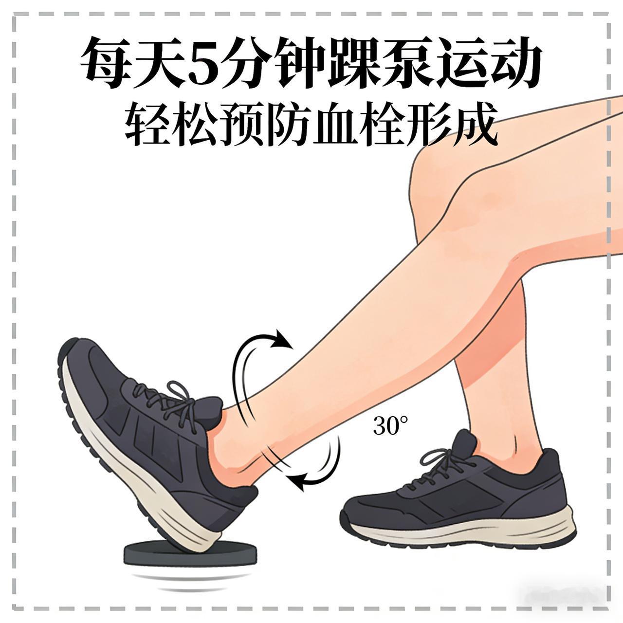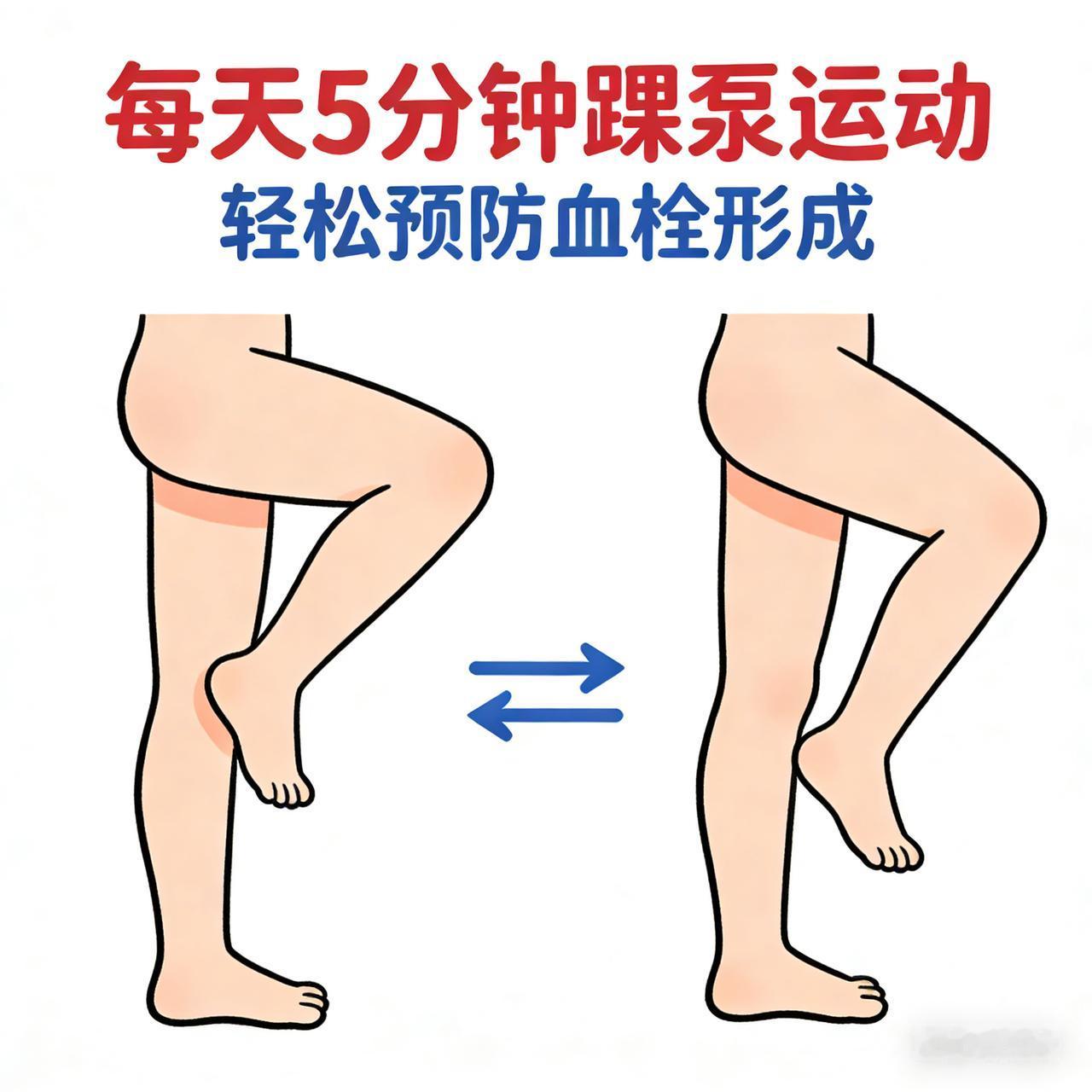 每天 5 分钟踝泵运动,轻松预防血栓形成 除了之前提到的“踝泵运动”,这里为您整理了一套专为老年人设计的“防血栓居家操”。这套动作更加注重安全性和全身血液循环,强度低、效果好,在家看电视、聊天甚至躺在床上都能做。 一、 坐姿系列(最安全,适合看电视时做) 1. 模拟踩单车(空中蹬车) • 动作: 坐在稳固的椅子上或床边,双腿抬起,像骑自行车一样交替蹬腿。 • 要点: 动作要慢,幅度不用太大,感受大腿肌肉收缩。 • 功效: 这是踝泵运动的“进阶版”,能同时活动髋、膝、踝三个关节,对大腿和小腿的肌肉泵刺激更强。建议做30-50次,累了就休息。 2. 坐姿踢腿(股四头肌训练) • 动作: 坐直,双手扶住椅子扶手保持平衡。将一条腿伸直抬起,脚尖勾起,坚持5-10秒后放下。 • 要点: 抬腿时大腿肌肉要绷紧(用力锁住膝盖),这是预防血栓的关键发力点。 • 功效: 专门强化大腿前侧肌肉,帮助下肢血液逆流回心脏。左右腿交替,各做10-15次。 3. 双手握拳松拳 • 动作: 双臂平举,快速用力握拳,然后迅速张开手掌。 • 功效: 不要忽视上肢!这个动作能促进上肢血液回流,预防上肢血栓,同时还能锻炼手脑协调性。建议做1分钟。 二、 卧姿系列(适合早起醒来或睡前) 1. 臀桥运动(改良版) • 动作: 仰卧,双腿弯曲,双脚踩床。用臀部力量将屁股轻轻抬离床面,保持3-5秒后缓慢放下。 • 功效: 活动髋关节和骨盆区域,改善盆腔及下肢血液循环。 • 注意: 不用抬太高,避免腰部受力过大。 2. 直腿抬高 • 动作: 仰卧,一腿弯曲踩床(保护腰部),另一条腿伸直缓慢抬高至45度,坚持5秒放下。 • 功效: 强力收缩大腿肌肉,像泵一样把血液挤向心脏。 三、 站姿系列(需扶墙或扶椅背,防跌倒) 1. 踮脚尖(提踵) • 动作: 手扶椅背或墙壁,双脚并拢,缓慢踮起脚尖,最高点停留3秒,再缓慢落下。 • 功效: 这是对抗地心引力最直接的动作,能有效预防下肢静脉曲张和血栓。 • 频率: 做10-15次为一组,每天3组。 2. 原地高抬腿(慢速) • 动作: 扶着桌子,左右腿交替缓慢抬起,像踏步一样,尽量让膝盖抬到腹部高度。 • 功效: 激活腹部和腿部肌肉群,促进全身大循环。 ⚠️ 老人运动特别叮嘱: 1. 呼吸配合: 千万不要憋气!用力(如抬腿、踮脚)时呼气,放松时吸气。憋气会导致血压升高,增加心脑血管风险。 2. 循序渐进: 不要追求数量,感到肌肉微酸即可。如果有头晕、胸闷,立即停止。 3. 多喝水: 运动前后喝一杯温水,能降低血液黏稠度,让“泵”出来的血液更流畅。 4. 禁忌: 如果腿部已经有红肿、发热、剧痛,或者被医生确诊有血栓形成,千万不要随意按摩或剧烈运动,以免血栓脱落引发肺栓塞,需遵医嘱治疗。 这套动作组合起来每天只需10-15分钟,分次完成,就能给血管做一次全方位的“大扫除”!