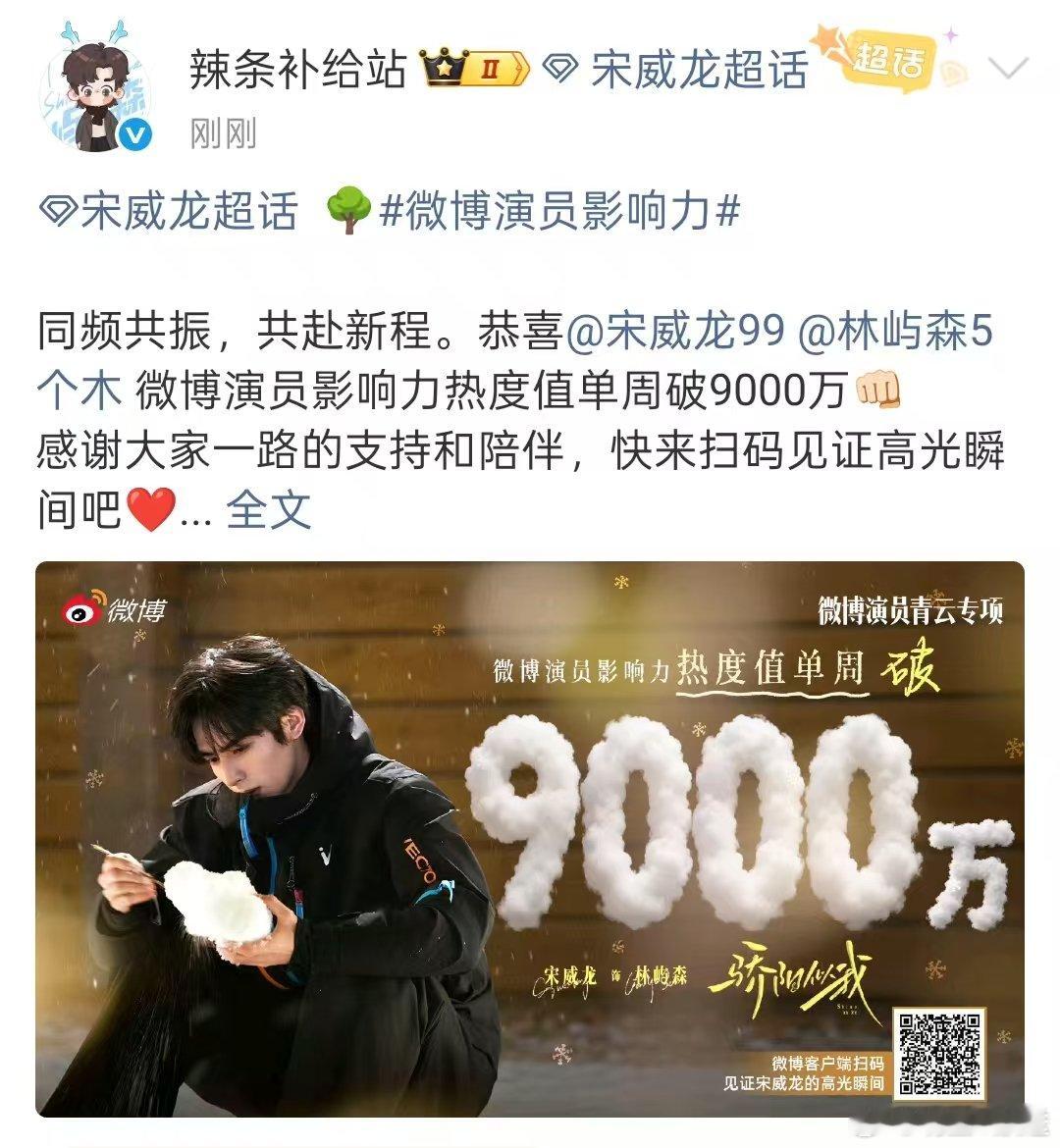 宋威龙微博演员热度值单周破9000万 恭喜宋威龙单周热度值突破9000万!他演绎的林屿森,从清冷开场到温柔深陷的极致反差深入人心,将角色内心破茧成蝶的过程刻画得层次丰富,高热度是对其纯爱系演绎的高度认可。