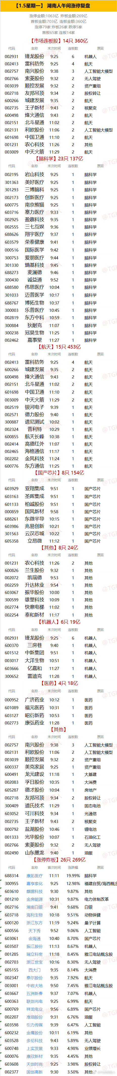 【1.5星期一】 湖南人午间涨停复盘 "涨停金额:1063亿 炸板金额:269亿首板金额:703亿 连板金额:360亿涨停79家 炸板26家 跌停5家首板65家 连板14家" 【市场连板股】14只 360亿 代码 名称 末次时间 连板数 原因002931 锋龙股份 9:25 6 机器人002413 雷科防务 9:25 4 航天002757 南兴股份 9:38 3 人工智能大模型002766 索菱股份 9:32 2 无人驾驶003039 顺控发展 9:32 2 资产重组002718 友邦吊顶 9:34 2 股权转让600266 城建发展 9:35 2 航天002735 王子新材 9:43 2 核聚变600498 烽火通信 9:43 2 航天002151 北斗星通 11:02 2 航天002131 利欧股份 11:06 2 人工智能大模型601698 中国卫通 11:10 2 航天001231 农心科技 11:26 2 其他003009 中天火箭 11:29 2 航天【脑科学】23只 137亿 代码 名称 末次时间 连板数 原因002195 岩山科技 9:25 1 脑科学301363 美好医疗 9:25 1 脑科学301293 三博脑科 9:25 1 脑科学002173 创新医疗 9:25 1 脑科学600775 南京熊猫 9:25 1 脑科学603716 塞力医疗 9:33 1 脑科学002925 盈趣科技 9:35 1 脑科学002555 三七互娱 9:36 1 脑科学688626 翔宇医疗 9:37 1 脑科学603579 荣泰健康 9:41 1 脑科学000516 国际医学 9:42 1 脑科学300753 爱朋医疗 9:44 1 脑科学301330 熵基科技 9:45 1 脑科学688273 麦澜德 9:46 1 脑科学300430 诚益通 9:52 1 脑科学688580 伟思医疗 10:04 1 脑科学301033 迈普医学 10:17 1 脑科学688767 博拓生物 10:37 1 脑科学300003 乐普医疗 10:45 1 脑科学002819 东方中科 10:59 1 脑科学300884 狄耐克 11:07 1 脑科学300238 冠昊生物 11:25 1 脑科学002462 嘉事堂 11:27 1 脑科学【航天】15只 453亿 代码 名称 末次时间 连板数 原因002413 雷科防务 9:25 4 航天600266 城建发展 9:35 2 航天600498 烽火通信 9:43 2 航天002151 北斗星通 11:02 2 航天601698 中国卫通 11:10 2 航天003009 中天火箭 11:29 2 航天002519 银河电子 9:39 1 航天002571 德力股份 9:40 1 航天300887 谱尼测试 10:02 1 航天002324 普利特 10:29 1 航天600855 航天长峰 10:38 1 航天002414 高德红外 11:07 1 航天002465 海格通信 11:17 1 航天002202 金风科技 11:24 1 航天600776 东方通信 11:25 1 航天【国产芯片】8只 154亿 代码 名称 末次时间 连板数 原因603929 亚翔集成 9:51 1 国产芯片603163 圣晖集成 9:51 1 国产芯片601133 柏诚股份 9:51 1 国产芯片000859 国风新材 9:58 1 国产芯片688261 东微半导 10:15 1 国产芯片603986 兆易创新 10:21 1 国产芯片301563 云汉芯城 10:22 1 国产芯片605358 立昂微 11:12 1 国产芯片【其他】8只 24亿 代码 名称 末次时间 连板数 原因001231 农心科技 11:26 2 其他600826 兰生股份 9:32 1 其他002072 凯瑞德 9:53 1 其他002259 升达林业 9:54 1 其他603067 振华股份 10:00 1 其他300599 雄塑科技 10:09 1 其他002774 快意电梯 11:02 1 其他002254 泰和新材 11:17 1 其他【机器人】6只 19亿 代码 名称 末次时间 连板数 原因002931 锋龙股份 9:25 6 机器人600370 三房巷 9:40 1 机器人601512 中新集团 9:51 1 机器人003017 大洋生物 10:51 1 机器人603666 亿嘉和 11:27 1 机器人300652 雷迪克 11:28 1 机器人【医药】4只 18亿 代码 名称 末次时间 连板数 原因000952 广济药业 10:12 1 医药601089 福元医药 10:31 1 医药603127 昭衍新药 10:53 1 医药002773 康弘药业 11:28 1 医药【其他】 代码 名称 末次时间 连板数 原因002757 南兴股份 9:38 3 人工智能大模型002131 利欧股份 11:06 2 人工智能大模型003039 顺控发展 9:32 2 资产重组600337 美克家居 9:25 1 资产重组600491 龙元建设 11:18 1 大基建002083 孚日股份 10:35 1 大消费605287 德才股份 10:04 1 房地产002718 友邦吊顶 9:34 2 股权转让300409 道氏技术 11:29 1 固态电池603052 可川科技 9:34 1 光通信002735 王子新材 9:43 2 核聚变000792 盐湖股份 10:46 1 锂电池001333 光华股份 10:07 1 石油化工002766 索菱股份 9:32 2 无人驾驶002490 山东墨龙 9:40 1 油服【涨停炸板】26只 269亿 代码 名称 首次时间 涨跌幅 原因688314 康拓医疗 11:11 19.99% 脑科学300955 嘉亨家化 9:25 12.98% 福建自贸/海西概念603610 麒盛科技 9:30 9.87% 其他001210 金房能源 10:31 9.87% 电力体制改革002716 湖南白银 9:41 9.68% 白银603718 海利生物 10:18 9.51% 动物保健600120 浙江东方 11:19 9.24% 量子计算600556 天下秀 9:52 9.06% 人工智能603061 金海通 10:40 8.70% 国产芯片603507 振江股份 11:13 8.67% 机器人001285 瑞立科密 11:18 8.45% 雅江电站概念股002703 浙江世宝 10:16 8.30% 无人驾驶605155 西大门 9:35 8.14% 大消费002347 泰尔股份 9:35 7.92% 航天003001 中岩大地 9:50 7.45% 雅江电站概念股603667 五洲新春 9:37 7.07% 机器人600363 联创光电 9:25 6.99% 航天600769 祥龙电业 9:56 6.89% 国产芯片002207 准油股份 9:31 6.76% 油服603598 引力传媒 9:39 6.47% 人工智能600232 金鹰股份 10:11 6.19% 其他603528 多伦科技 9:43 5.89% 无人驾驶600748 上实发展 9:33 4.98% 业绩增长600076 康欣新材 9:35 4.45% 其他603608 天创时尚 9:25 3.98% 股权转让002377 国创高新 9:30 3.50% 其他