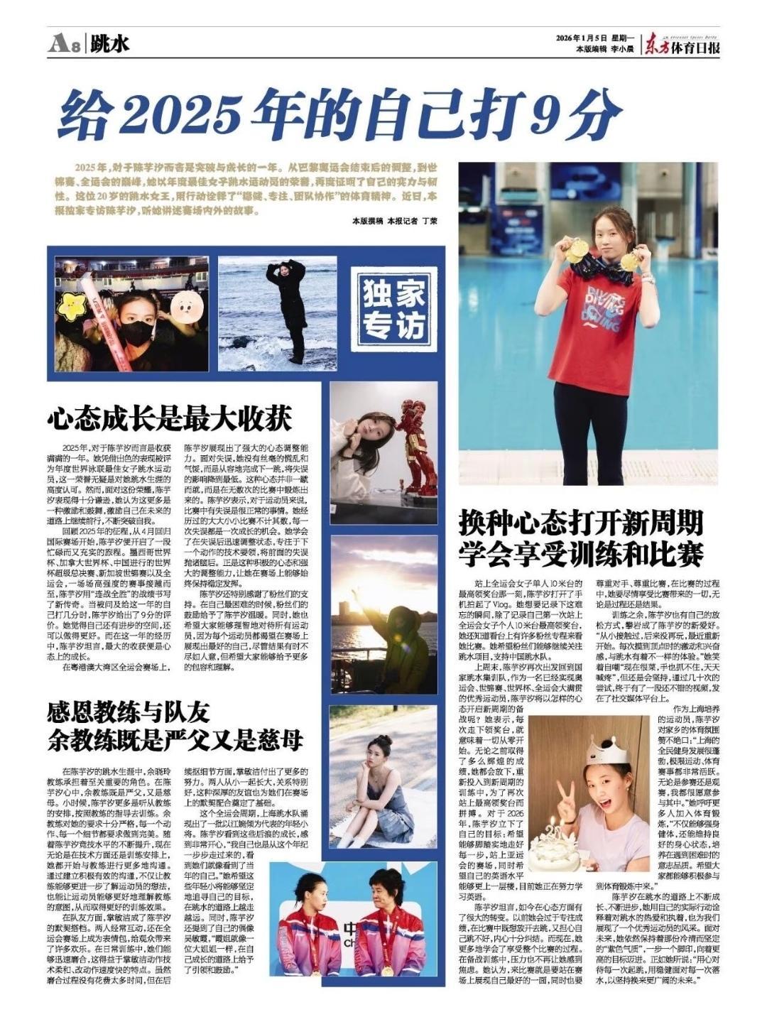 这两天看到陈芋汐的专访,小姑娘打扮得挺精神,穿了件浅紫色带帽外套,看着干净又大方。 说起过去的一年,她给自己打了9分,看来对2025年的表现挺满意。聊到新年愿望,她说2026年希望能走上亚运会的舞台,还打算把英语再往上提一提,采访时候她总是笑眯眯的,心情不错的样子。 陈芋汐聊完天还和大家合了影,态度很亲切,听完陈芋汐的采访,感受到她在一步一个脚印地往前走,真是挺踏实的。